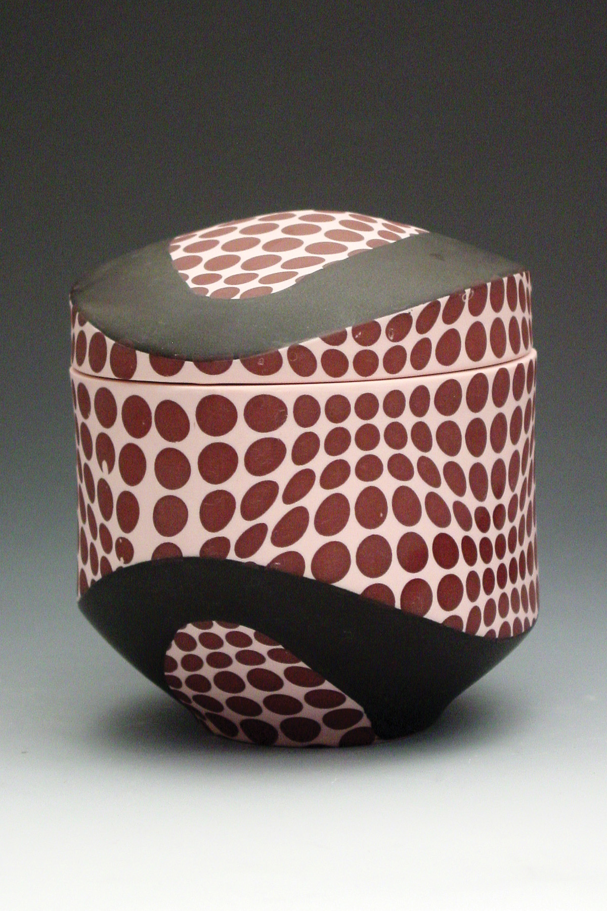 I leave patterned areas on the outside of my vessels unglazed to expose the colored clay underneath. Stickers and masking tape work great as a glaze resist and give a far crisper and better line quality than anything I can achieve using wax and a brush.