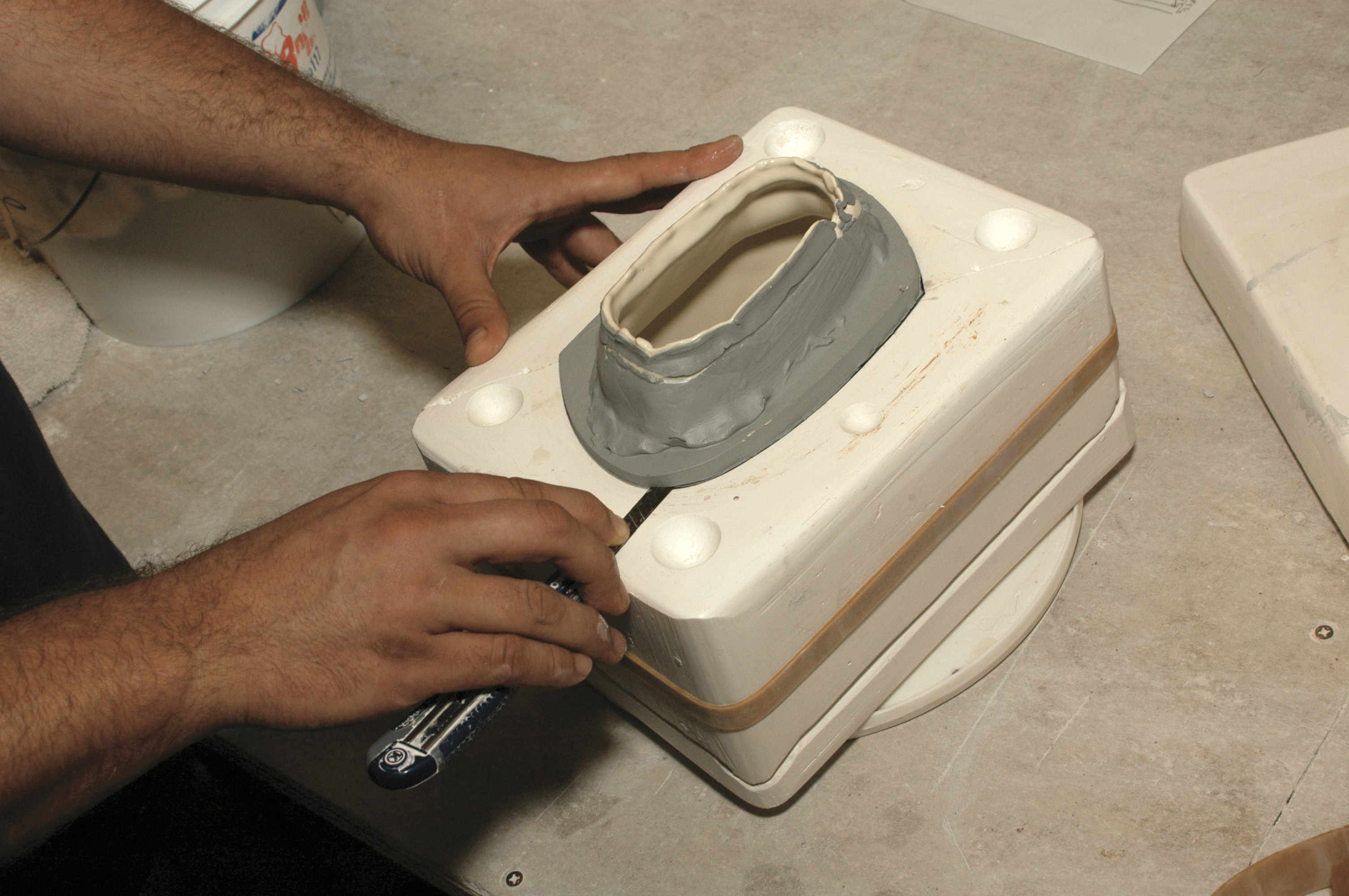 Remove the top piece of the mold (here the pouring gate section is removed first) when the slip is no longer glossy or tacky. Using an X-Acto knife, cut away the excess clay. Hold the blade flush with the top of the mold as a guide, After piercing the form in one spot, angle the blade in the same direction of your cut so that you’re always cutting the interior wall first, then moving through to the exterior. By doing so, you press the form back into the mold walls as you cut, and avoid warping the form by pulling the walls away from the mold (figure 7).