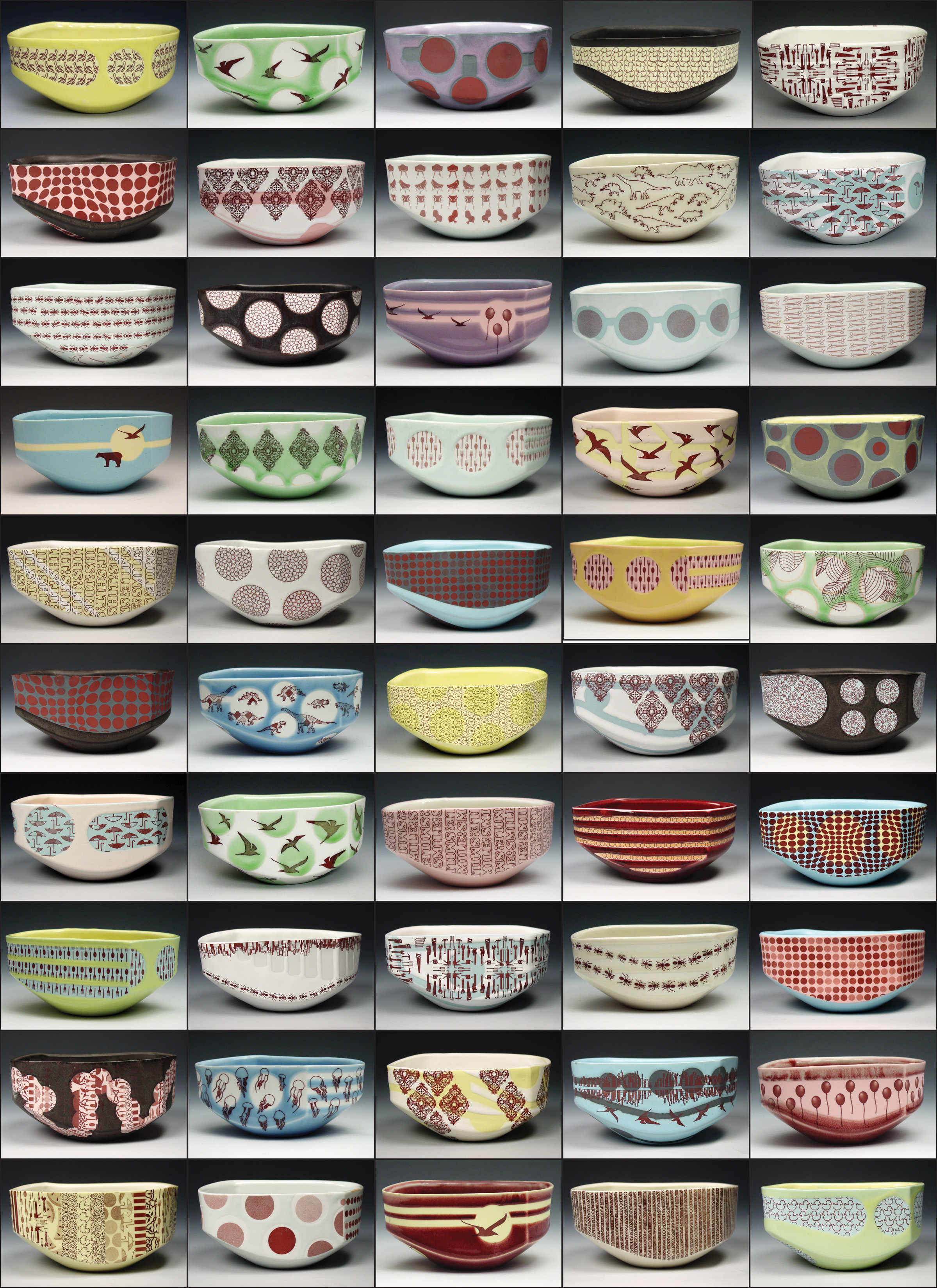 I make my own decals using a laser printer. I generate the images on a computer and then simply print onto water slide decal paper. HP laser printers work well and some types of copiers also make these decals. I use decal paper from www.papilio.com. You can also make handmade drawings to scale or use found images and then scan them into a computer or have them photocopied, just as long as they are printed on water slide decal paper. (For more information, you can also refer to the article on laser transfer decals by Frank Gayados on p. 7 in the Sept/Oct 2006 issue of PMI, or the July 23, 2008 Ceramic Arts Daily feature “The Details on Decal Paper for Ceramics” by Paul Andrew Wandless.)