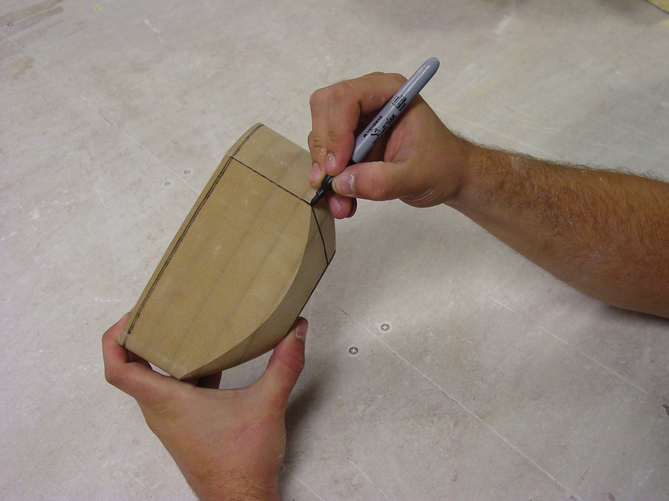 Using a band saw, I cut into the shape of the form, carefully following the outside edges of the glued-on template. The sides of the form are then sanded smooth to erase any irregularities from sawing. Finally, the prototype is sealed with one coat of Minwax Sanding Sealer and two coats of polyurethane.