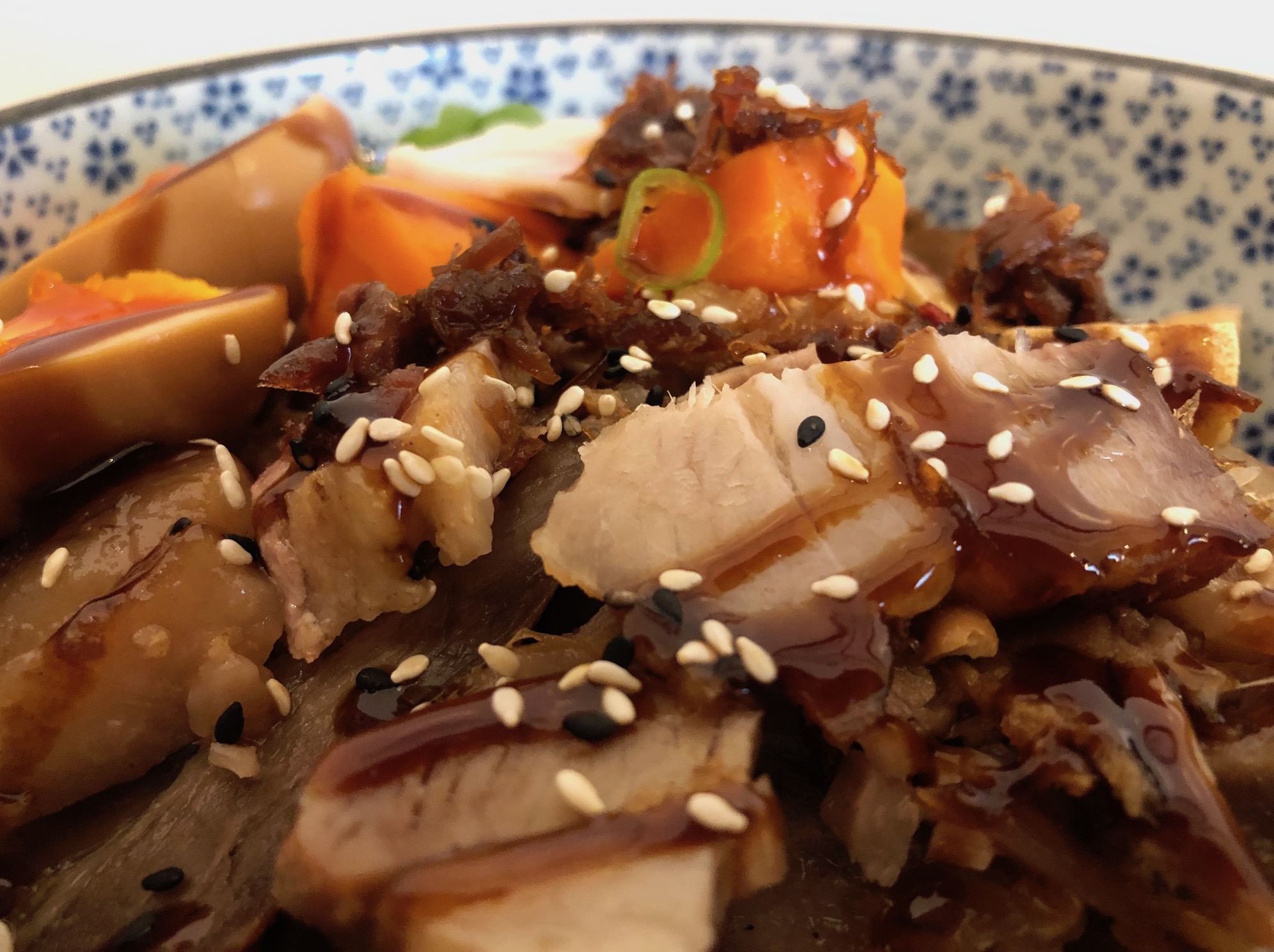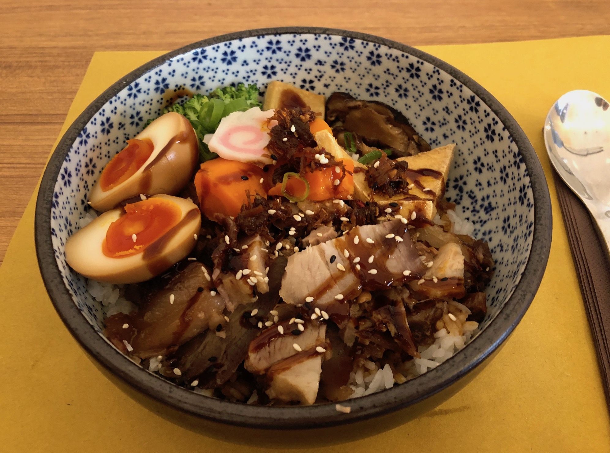 Il Chashu Don è un piatto a base di maiale, in questo caso arrosto e tagliato a pezzettini, servito con del riso, funghi, bambù, verdure, alghe, un uovo morbido marinato e salsa di Chashu.