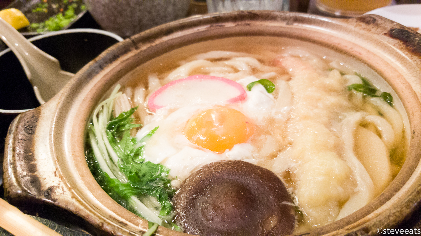 Hot Udon Noodle soup served in a clay pot with greens, fish cake, shiitake mushroom, shrimp tempura, chicken thigh, and a poached egg.