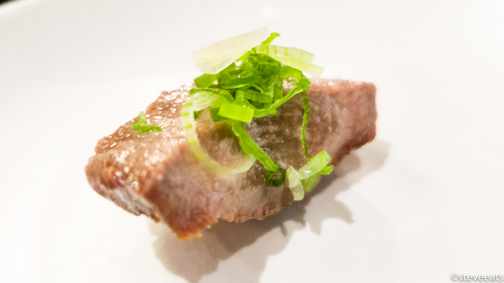 Thick slices of grilled ox tongue salted and topped with lemon and green onions.