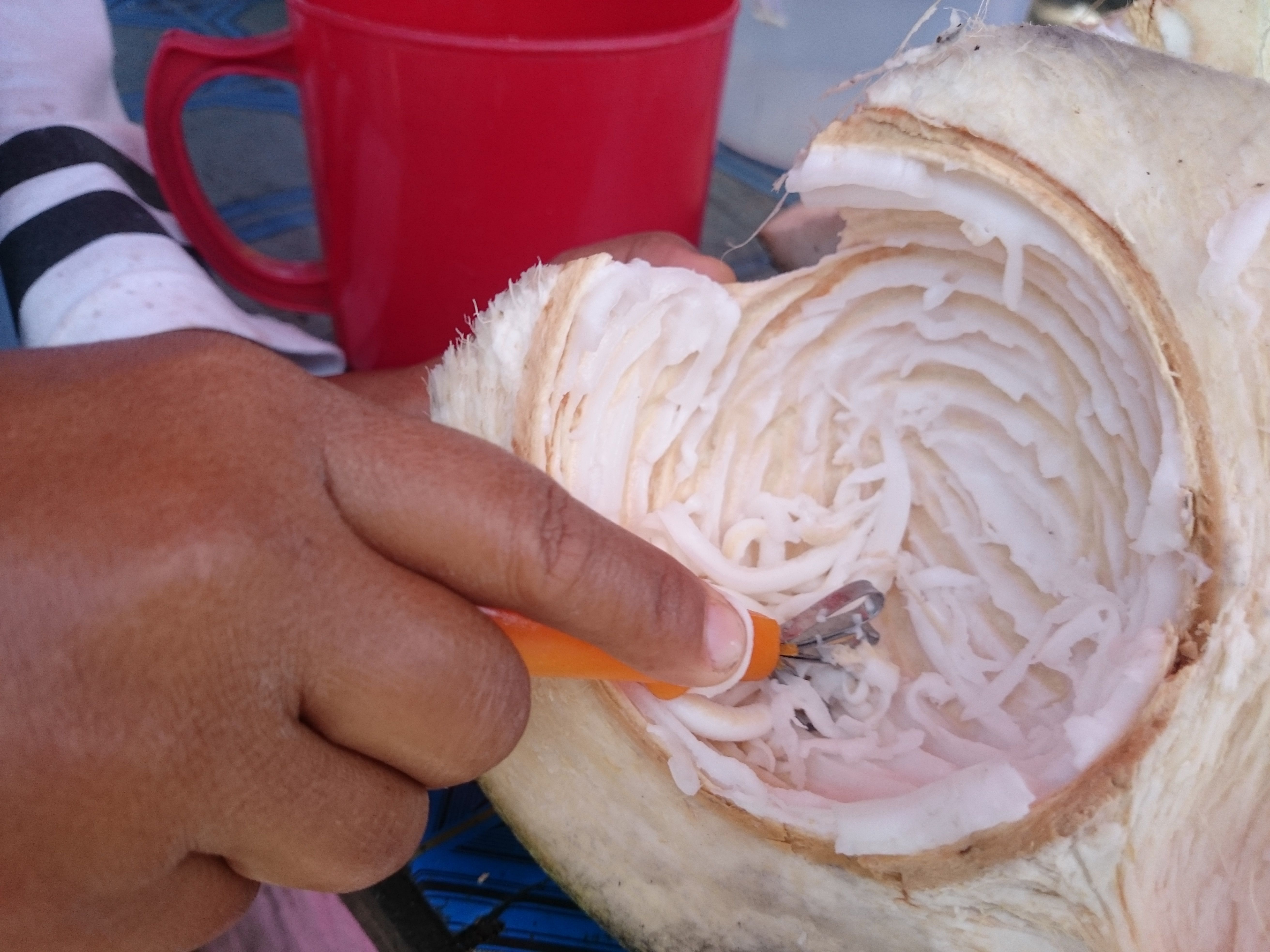 - Siapkan kelapa muda, belah dan pisahkan airnya agar mudah diparut isinya, lalu parut isi kelapa dengan menggunakan alat parut kasar seperti dibawah ini agar selain mudah diminum juga terlihat cantik.