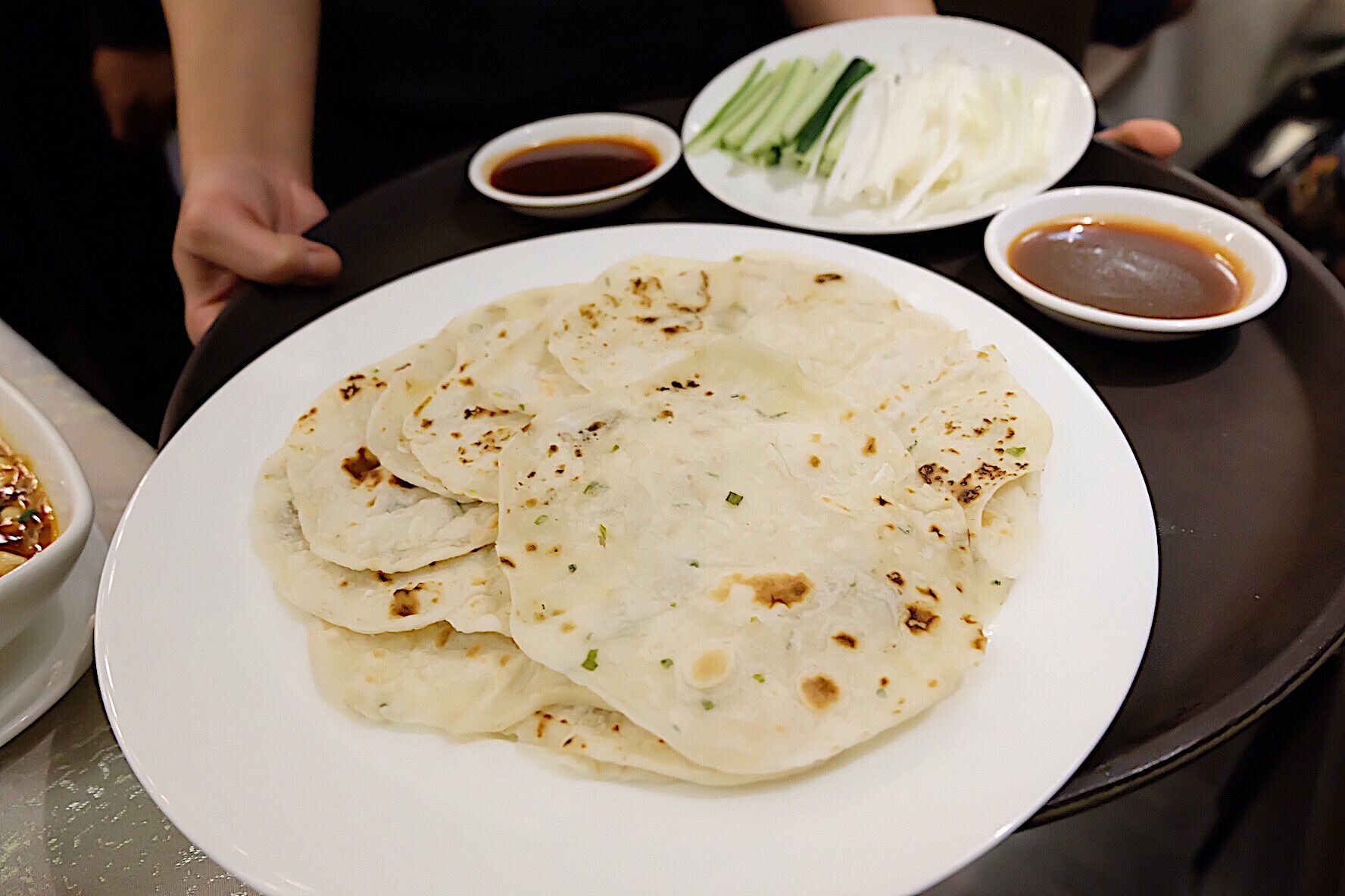 Is mouth watering. The Chinese invented this menu since the imperial era. The thin, crisp skin are eaten with spring onion, cucumber and sweet bean sauce with pancakes rolled around the fillings. The meat part can be cooked many different ways depending on the restaurant offering. We chosen stir fried with black pepper.