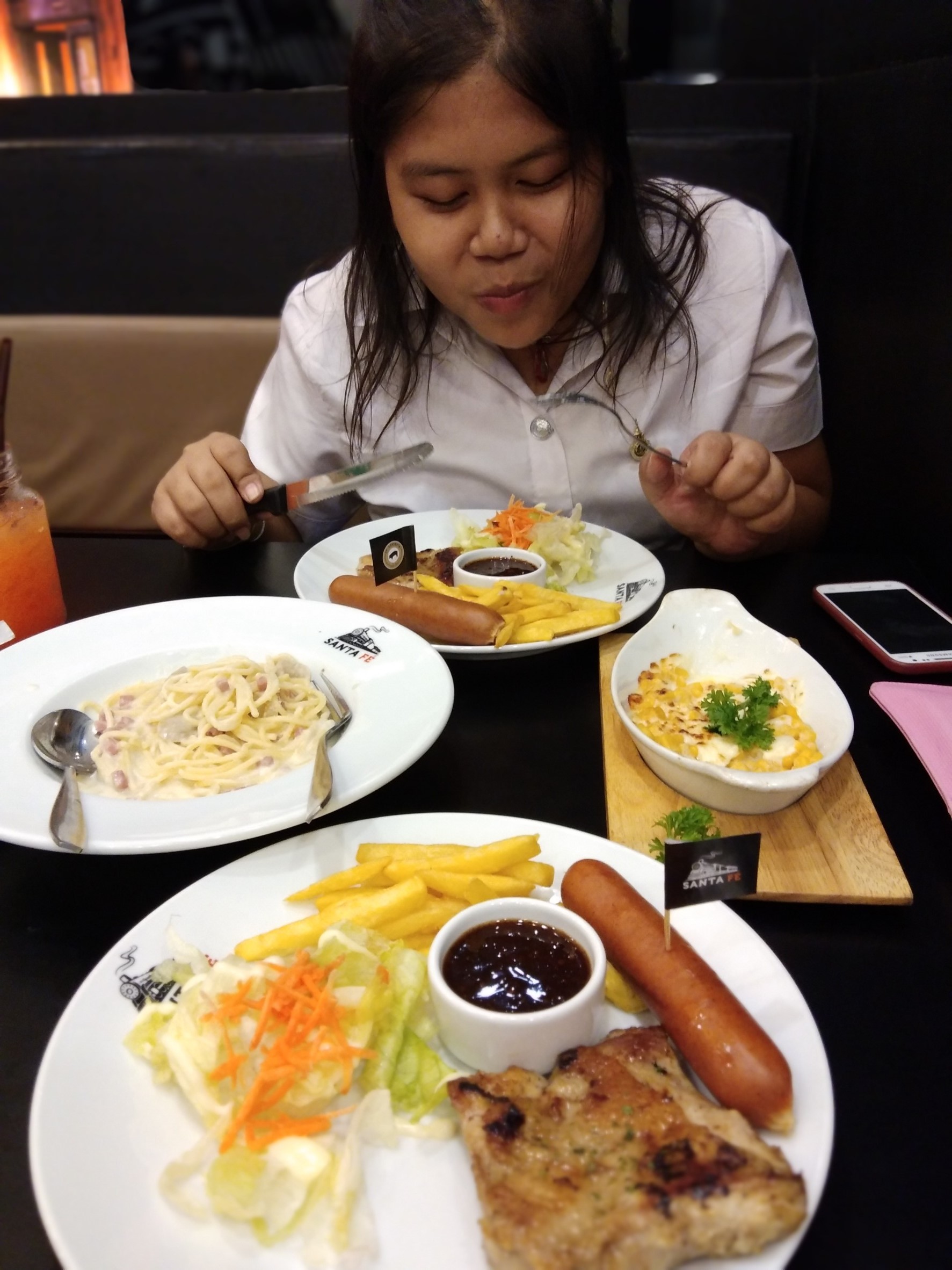 Next is the steak. First of all, eat steak for me. It's so bad Because I choose a restaurant that is not delicious. You think? You eat the chicken meat that takes half an hour to cut. It is both dry and tasteless at the same time. It makes me feel a bit stiff, but one day my friend invited me to eat steak at santa fe. At first I refused but My friends are convincing me to go. So I decided to eat a steak with my friends. That day, which was a good decision because the steaks were delicious that day. The meat is soft and has a little salty taste at the tip of the tongue. I remember the steak I ordered that day is Chicken steak with thai suace This dish has become my favorite food right now