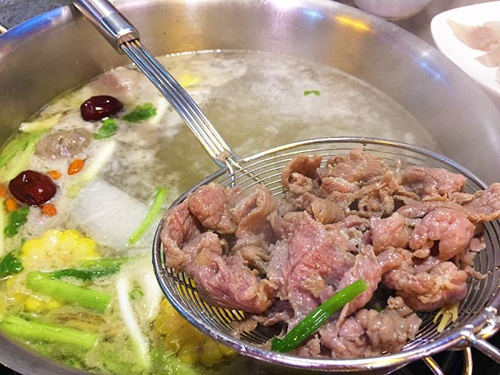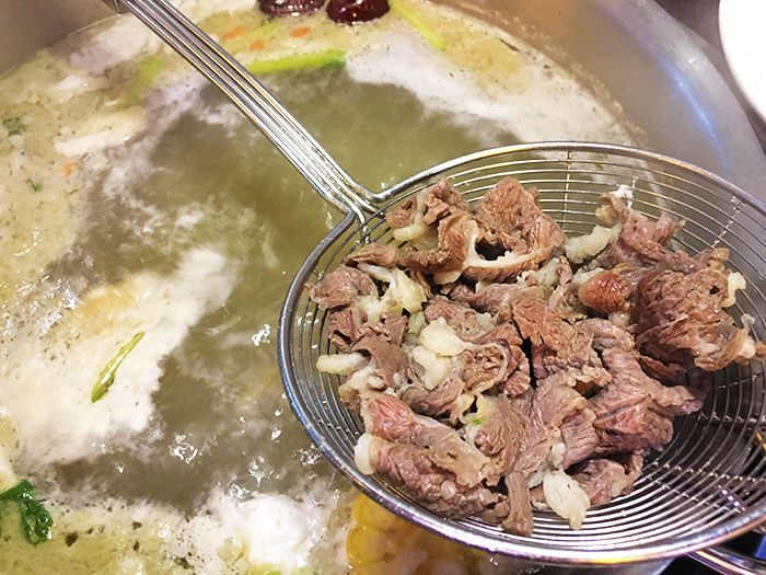 The first step when eating beef hotpot, is to take a sip of the beef flavoured soup. Usually some herbs are added which help to clear the soup and appetize the stomach. In the winter, it helps to warm your whole body up!