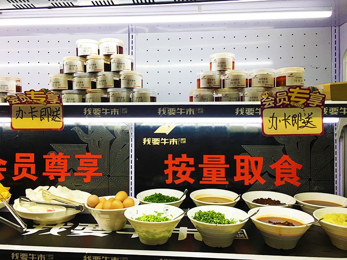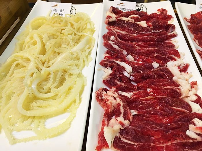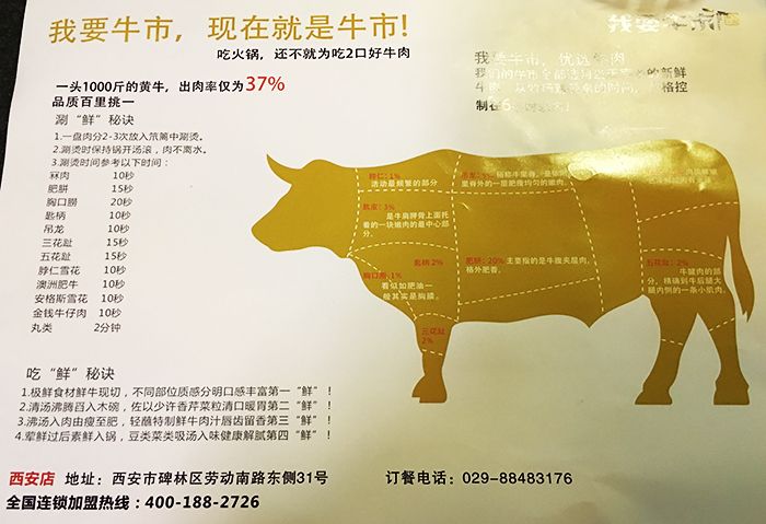 菜单上有仔细讲解了下这家火锅店牛肉鲜的秘诀,这家餐厅的牛肉能够保证是当天宰杀的新鲜牛肉,从牧场到餐桌则控制在6小时之内,听上去好酷。一头1000斤重的黄牛,只有37%被选为这家店提供给客人的牛肉,可见这家店的牛肉百里挑一。点菜很便捷,想吃的牛肉品种在前面划勾。出菜口的师傅好忙碌。牛肉的保存温度严格控制在0到4度。选择调料的地方,有各种甜的咸的酸的辣的调料,可以满足任何人的口味。如果你成为了这家店的会员,还可以选择水果,饮料,酒和各种小吃。餐桌上放着吃火锅会用到的纸巾包。碗上印着我要牛市,我想对于steemit的朋友看到会格外激动吧。下面赶快来和我一起吃出一片牛市吧!这是事先点的肉丸子,蔬菜,一会下到汤锅里。这是我们点了几种不同品种的牛肉。牛肉盘子上都放着纸条,提醒我们煮几分钟,因为不同的牛肉品种,牛身上的不同部位煮的时间都不一样。各种不同的蔬菜,配合牛肉一起吃来解腻。金黄的油条,这个可以直接吃了。吃牛肉火锅的第一步,先要喝一口牛肉清汤,放一些香芹菜可以清口暖胃,尤其在冬天喝起来非常香。仔细看看牛肉肉质超级嫩。