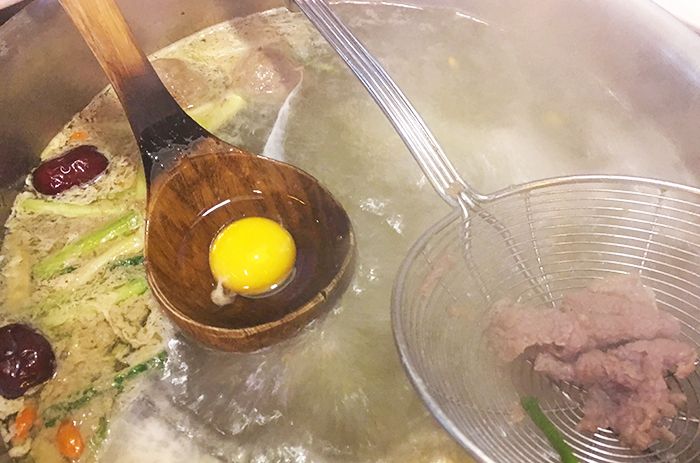 Of course, we don't dispose of the egg yolk as that would be a waste! It is added to the hotpot and can be eaten as well, it's like killing two birds with one stone!