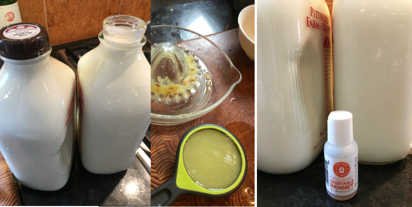 - Measure out 1/3 cup of either the lemon juice or vinegar. Measure out 1/4 cup of water and dissolve the rennet.