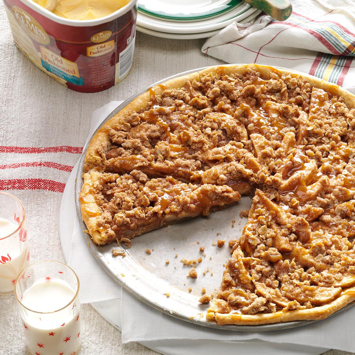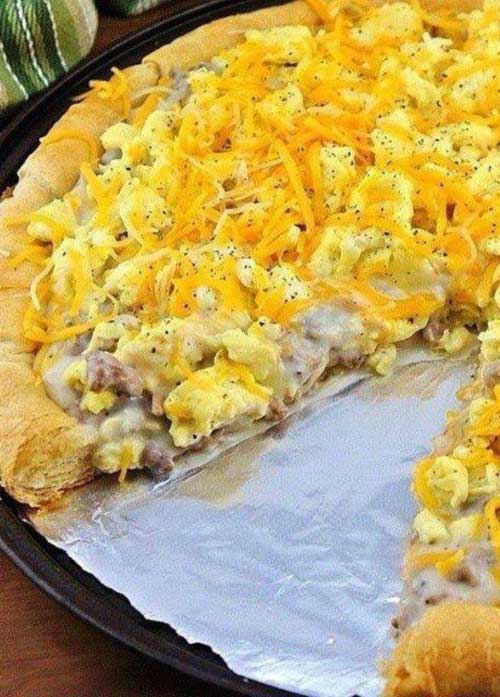 This recipe uses hashbrowns as a crust, straight up cheddar cheese for the sauce layer, and it's topped with eggs and bacon! My personal favorite breakfast pizza has a crescent roll crust, sausage gravy sauce, scrambled eggs, and cheddar cheese. There's nothing like a hot slice of pizza in the morning.