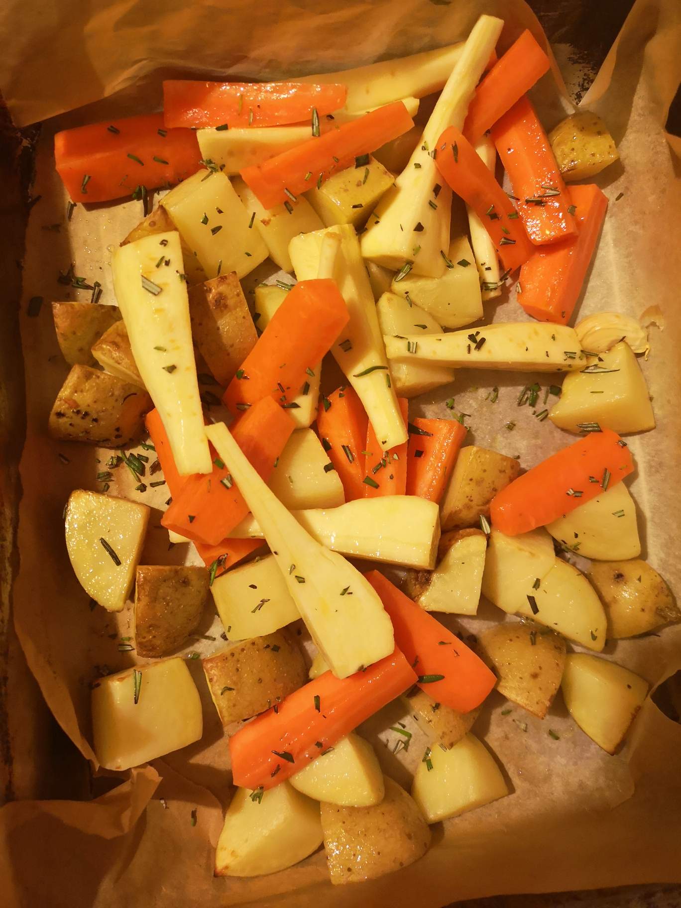 Bake the potatoes and vegetables seasoned with salt black pepper and chopped rosemary at 180° for 30 minutes.