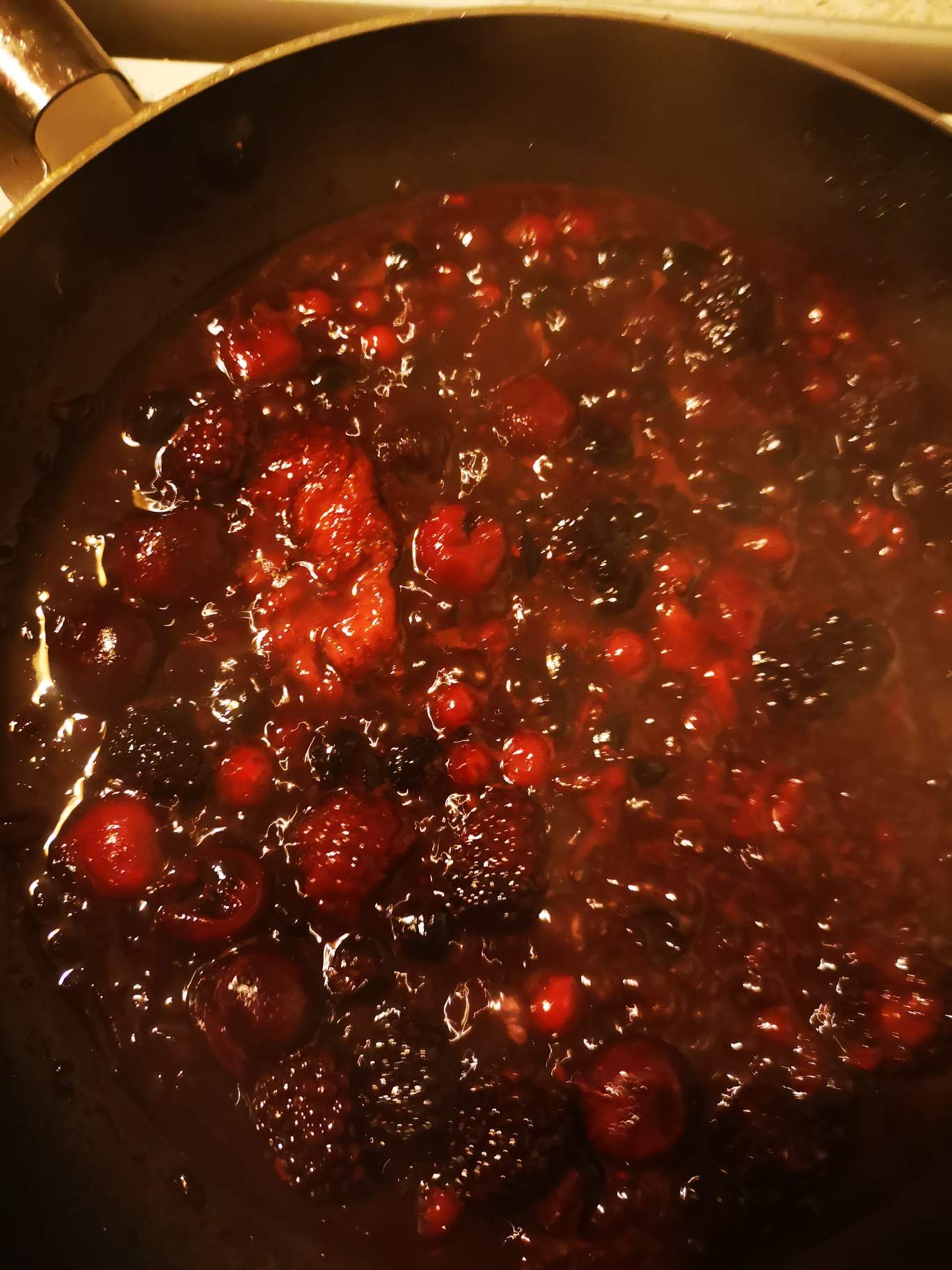 Cook in a pan the chopped Shallots with olive oil for a few minutes, add a splash of red wine and when starts to boil add the forest fruits, sugar and let it reduce.