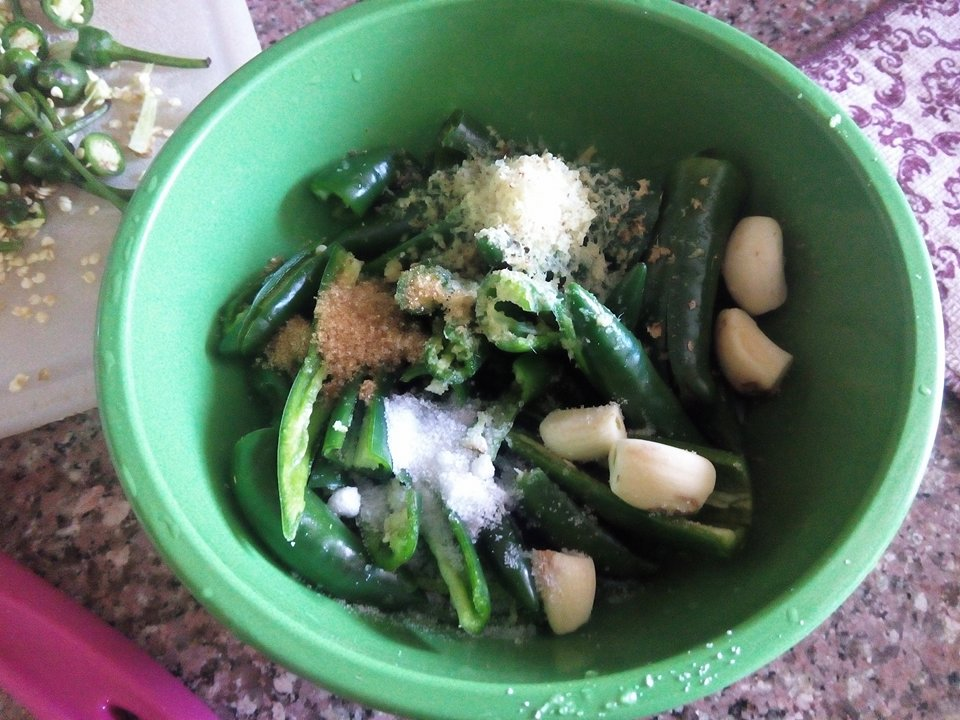 Add the sugar, salt, grated ginger, and garlic to the peppers after rinsing them quickly to quit rid of extra seeds.