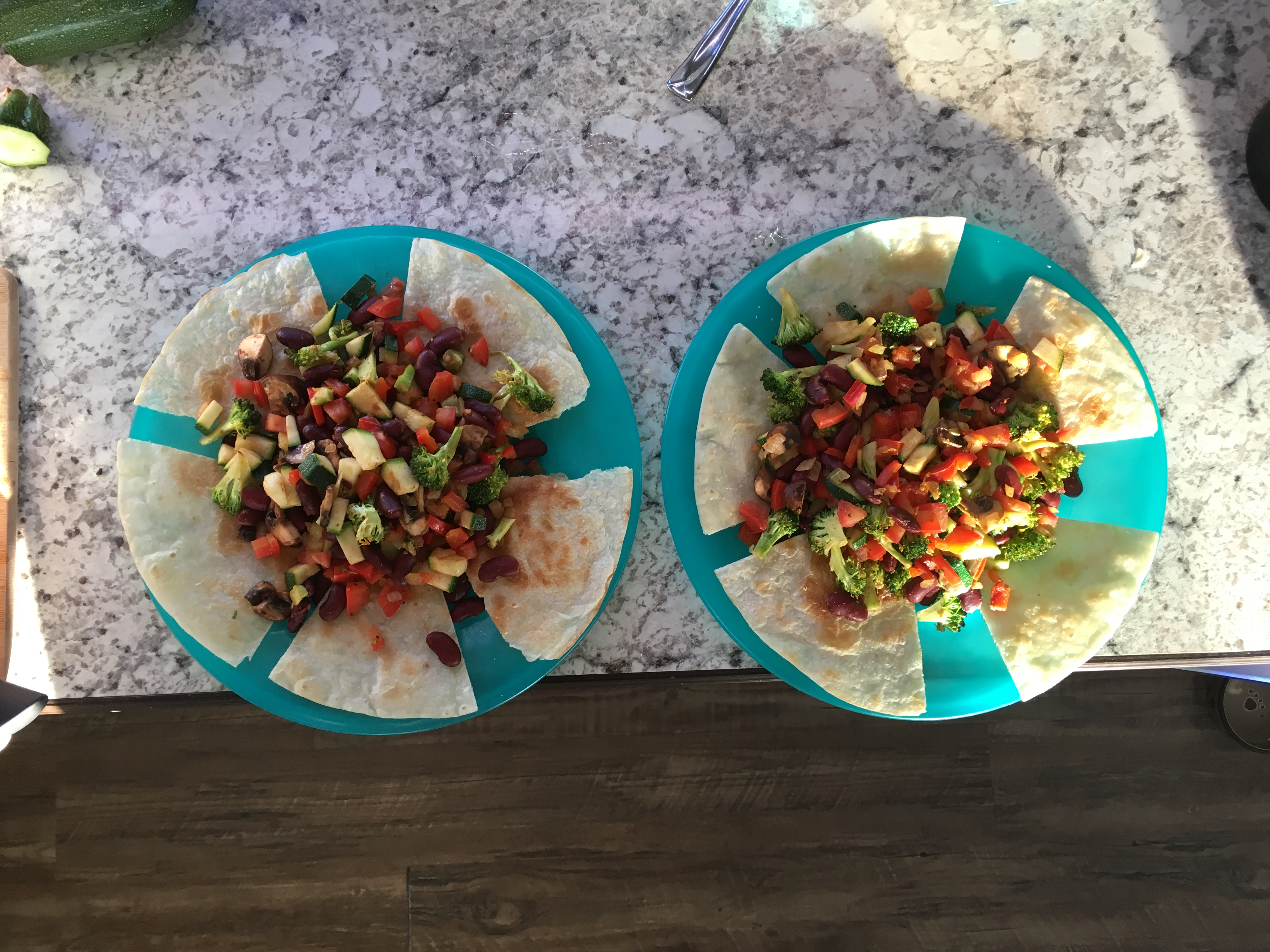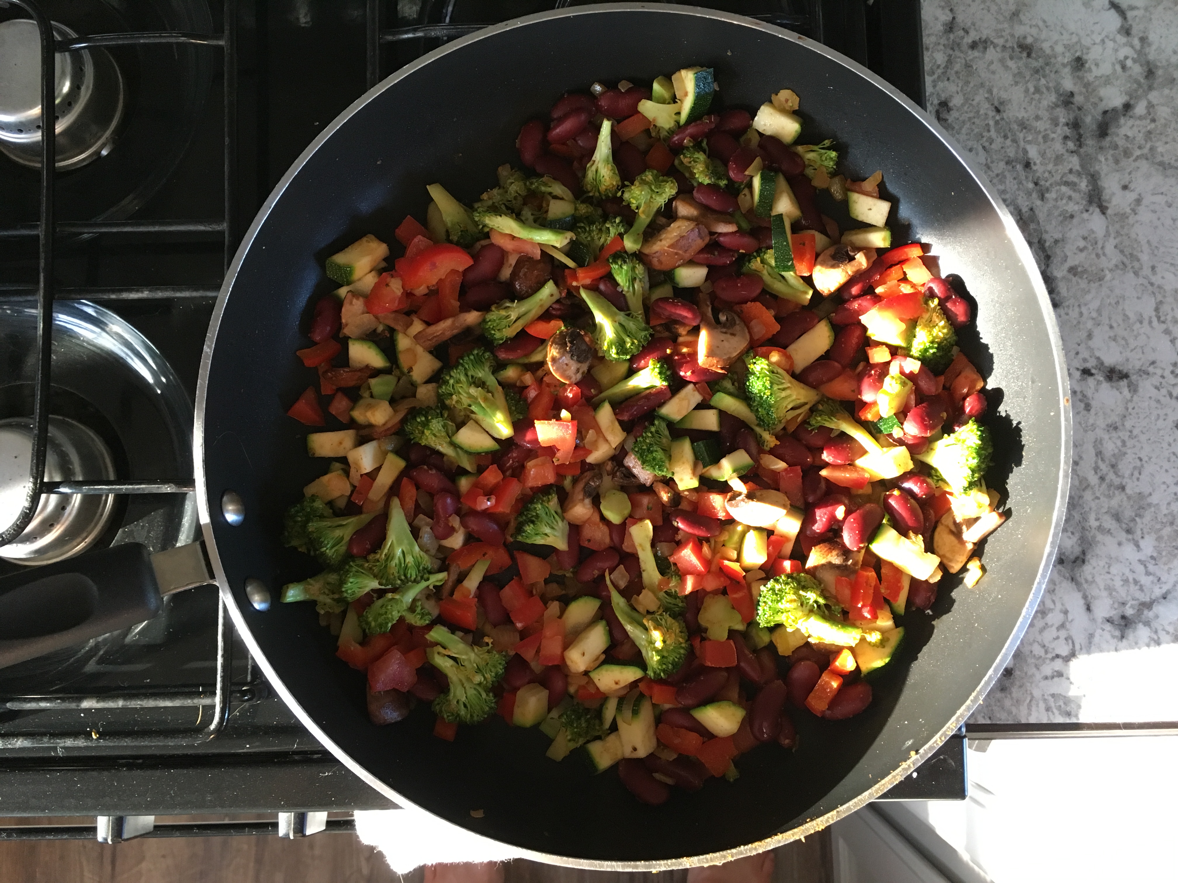 Next, fry up the toppings in the pan. I’m using onion, peppers, mushrooms, zucchini, broccoli and beans. It’s often served with chorizo sausage also if you’re a carnivore lol.