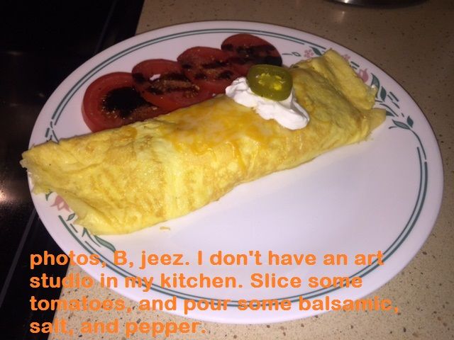 hahah love this post!!! Also it looks mighty fucking delicious boys! I have eggs lot of eggs, jalapenos check, cheese check I have no taco meat or sour cream fuck.... Looks like I'll use bbq chicken and coffee cream I guess