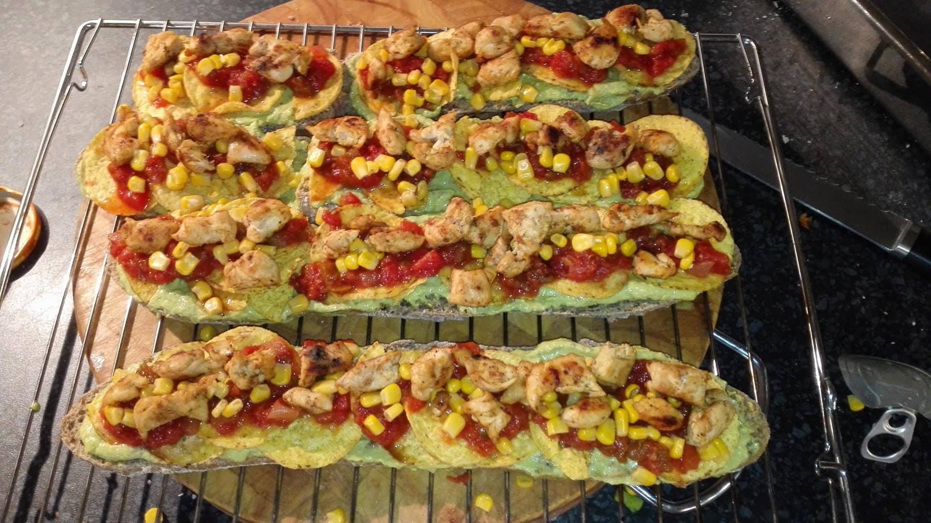 Then all you have to do is slice the baguettes and put guacamole on them with a spoon. Then put on some nacho/tortilla chips, salsa, corn and chicken filet cooked in a pan. It should look a little something like this delicious food: