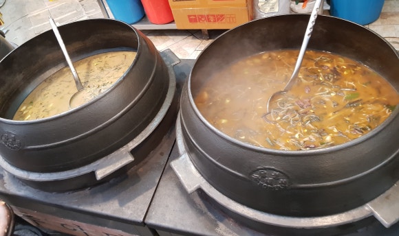 Some kinds of soup are boiling in Korean traditional caldron made of cast iron.(It is very huge. 👍). It is said that by korean traditional caldron, we can cook foods at a constant temperature for a long time and It makes the flavor of the foods deeper.