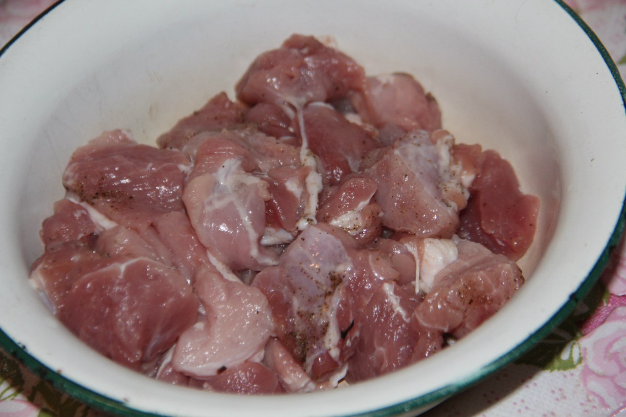 Method of preparation: 1. Pork tenderloin cut into medium-sized pieces, salt, pepper, add one clove crushed garlic, leave for 40 minutes. Then fry on high heat in vegetable oil for 10 minutes.