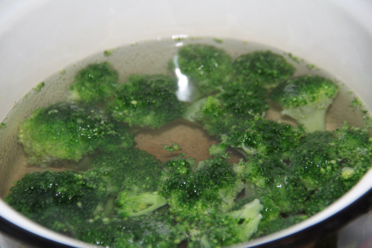 4. Broccoli disassemble on inflorescences in a pot, boil water, slightly potseluem added to boiling water with broccoli. Cook for 5 minutes.