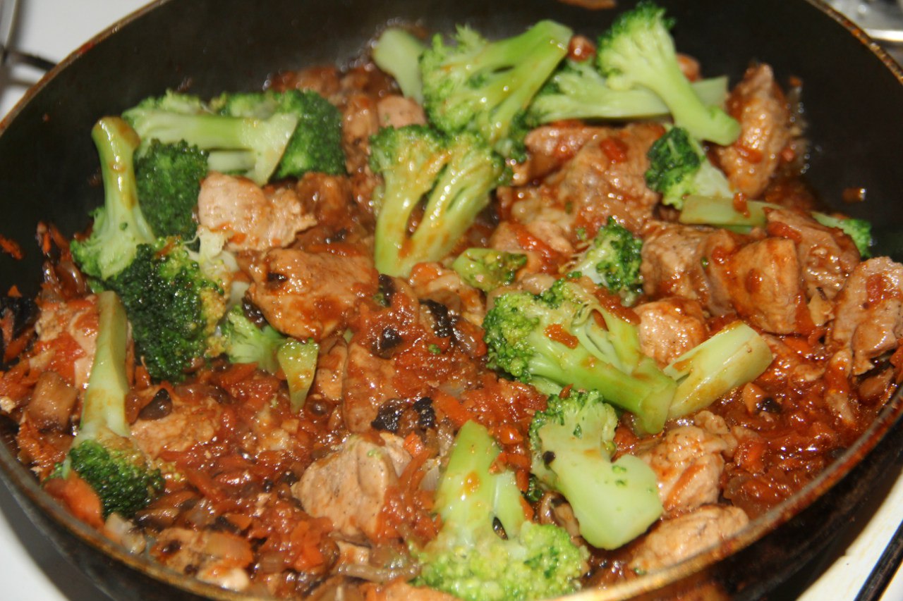 7. Add soy and tomato sauce, stir, reduce fire, simmer under a lid for 25 minutes.