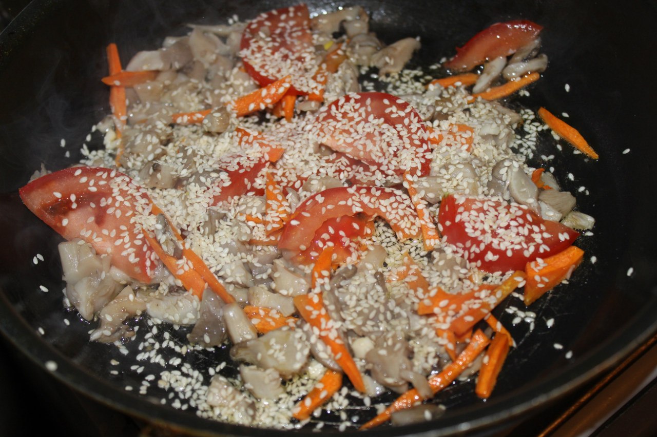 7. Add the mushrooms and vegetables tomato and sesame seeds. Fry more 5 minutes.