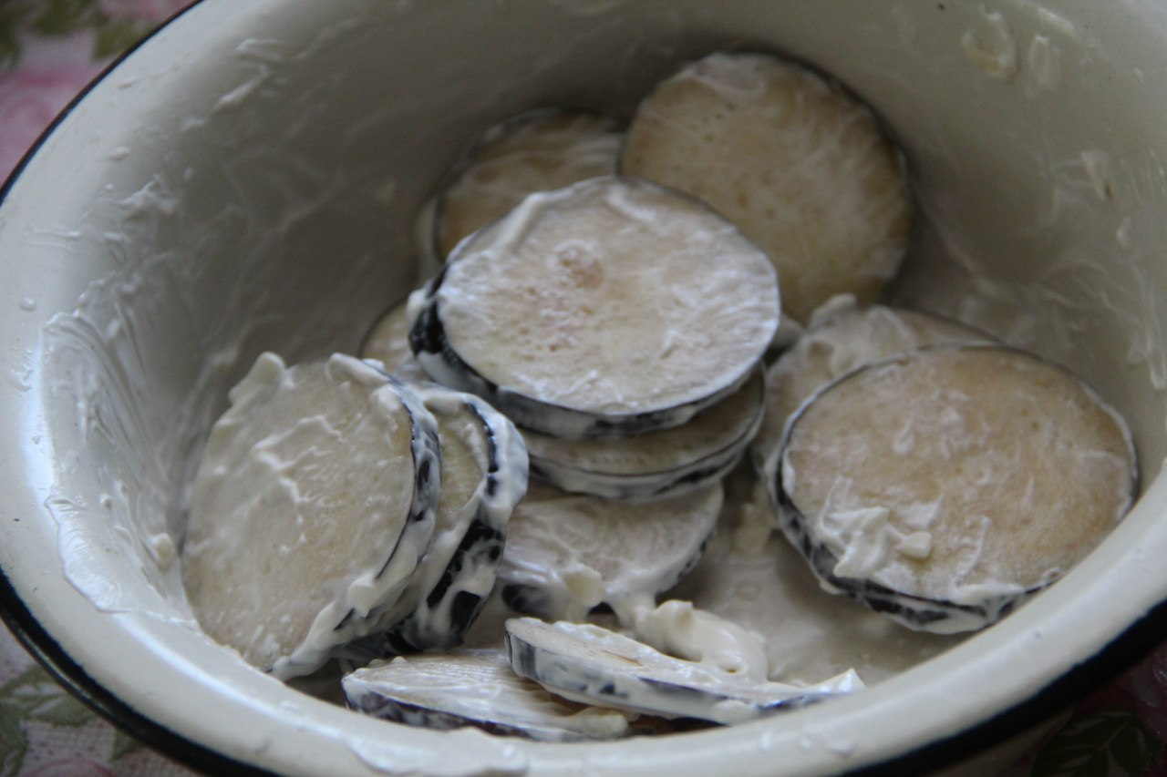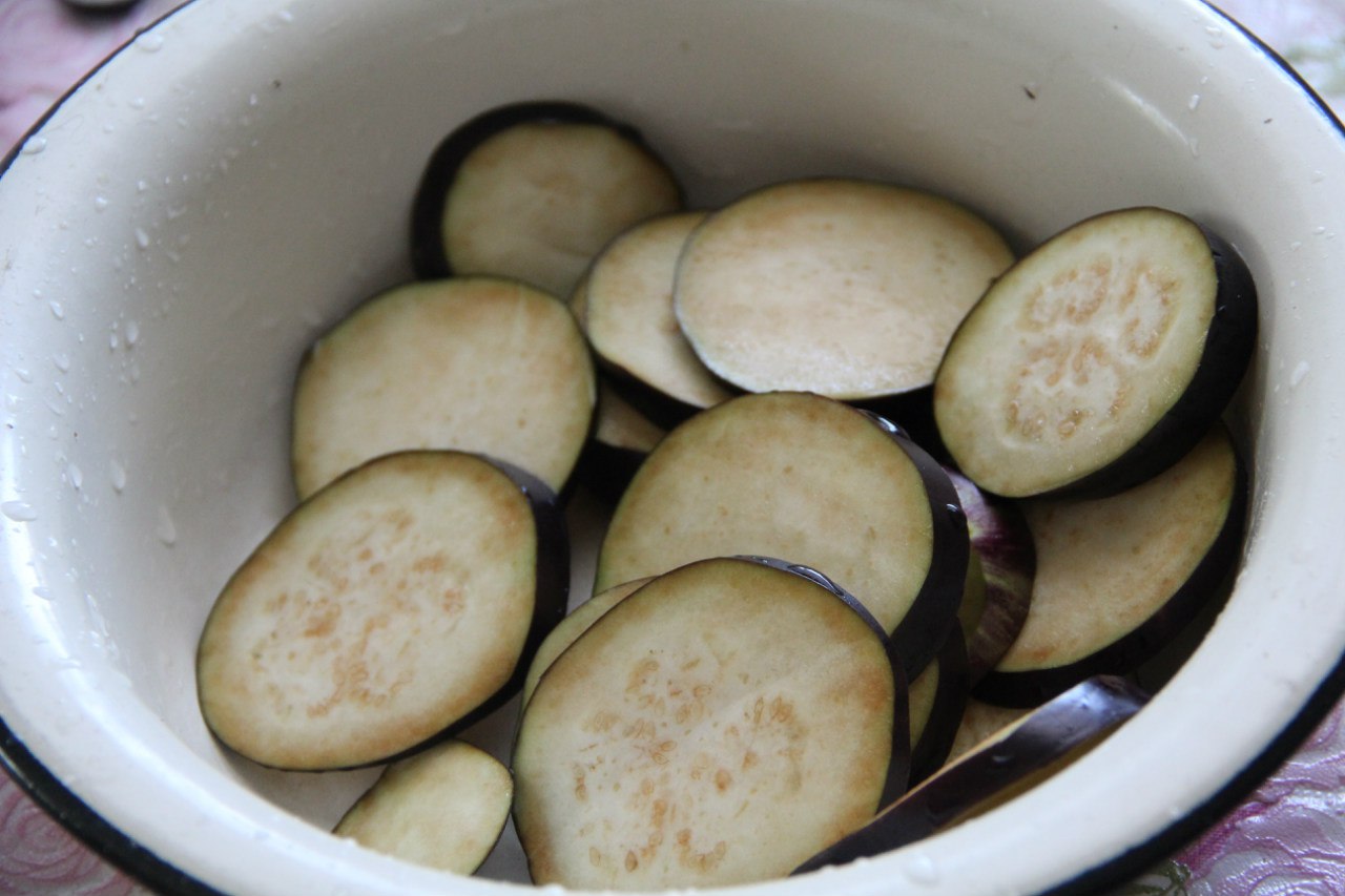 1. Eggplant wash, cut into slices with a width of 0,5-1 cm. RUB with salt, leave for 20 minutes.