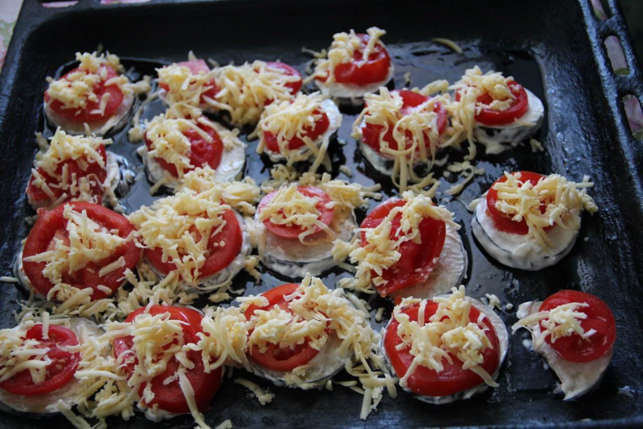 3. Lay the eggplant on a greased baking sheet, put a slice of tomato the same thickness.