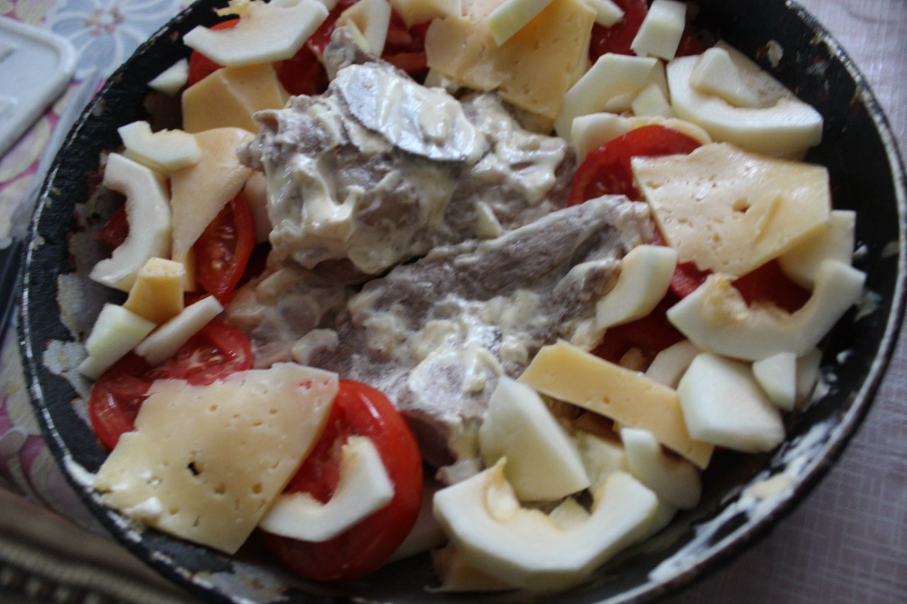 8. Spread together with the knuckle in a baking dish and zucchini slices layered with tomato slices and cheese. Cook in the oven for 30-40 minutes at a temperature of 200 C.