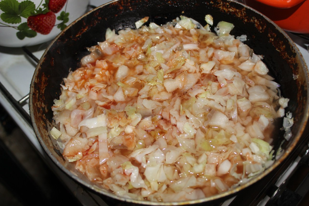 12. Add to the cabbage in the tomato sauce and boiling water, salt, pepper to taste, cover with a lid, reduce fire. Cook until evaporation of excess fluid.