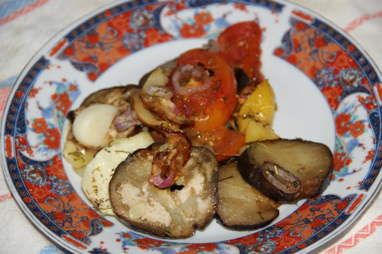 5. On a greased baking dish, alternately arrange the vegetables, put on top of onion rings, salt, pepper, put in the unpeeled clove of garlic and a piece of butter, sprinkle with herbs de Provence. Bake 30-35 minutes in the oven at 180 ° C.