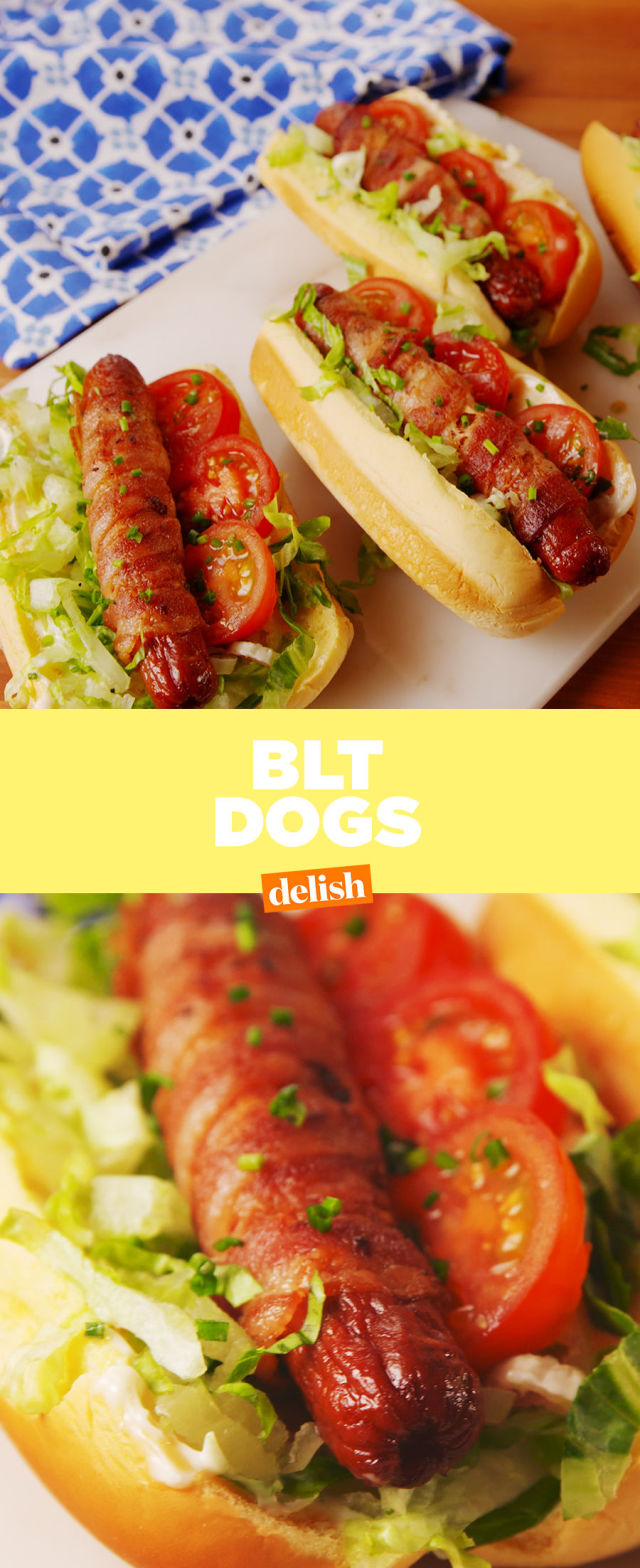 1. Preheat oven to 425°. Wrap a slice of bacon around each hot dog, securing the ends with toothpicks. Place on a baking sheet and bake until the bacon is crispy, about 20 minutes.