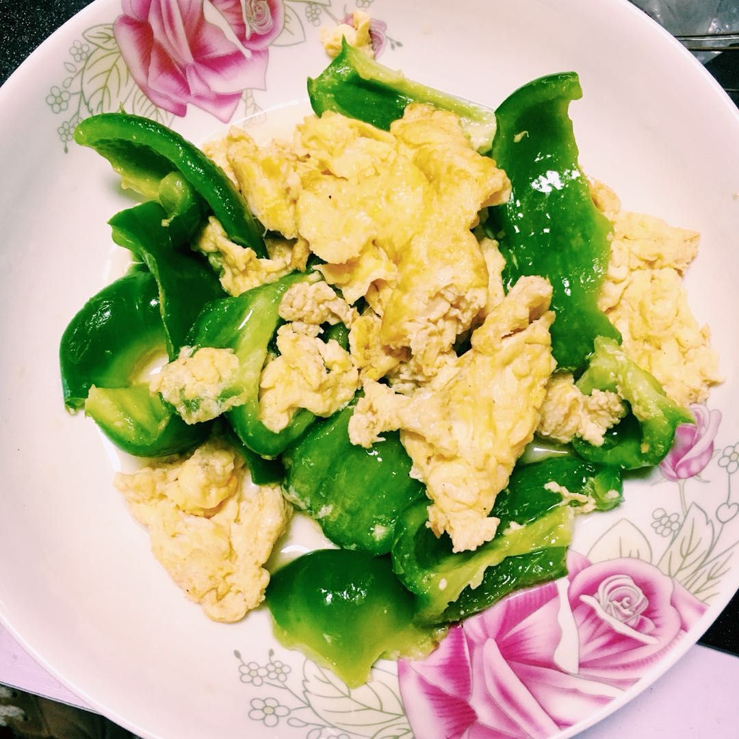 The last one is made of eggs and green peppers. Firstly, I fired the oil really hot ,and then put green peppers into the pan. After that , I put the egg liquid into the pan and mixed it with green peppers very quickly.