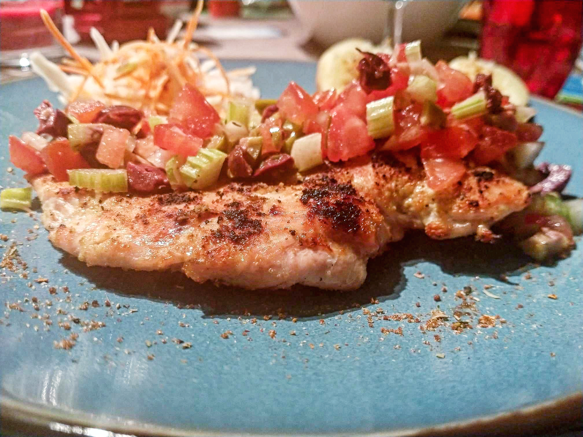 Following the recipe, I made a nice olive-tomato-celery relish with a little bit of thyme to accompany the chicken.
