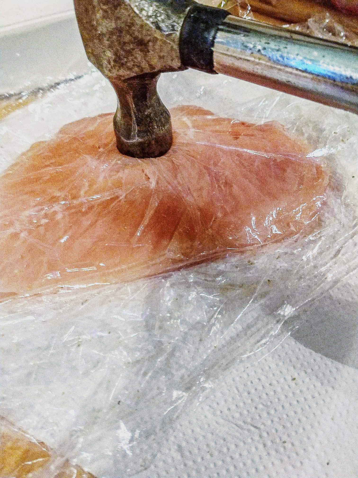For the chicken paillards, I flattened some chicken breasts with a hammer and a large pan (flattening them with the hammer, then evening them out by using pressure from a large and heavy skillet).