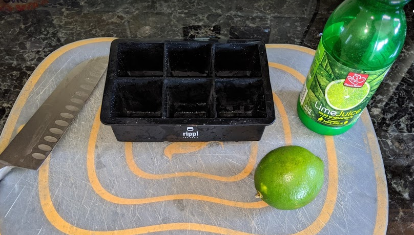 Keeping your drink cold is the number one job of ice but having it look wonderful and adding something special to your beverage is a nice bonus. Today I'm going to show you how to "sexy" up that ice with some simple tactics. Your going to need some lime juice, a lime, large format ice cube mold and a kitchen knife.