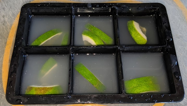 Pour the mixture into the mold and float in 1 or 2 pieces of lime wedge into each cell. Put in the freezer over night.
