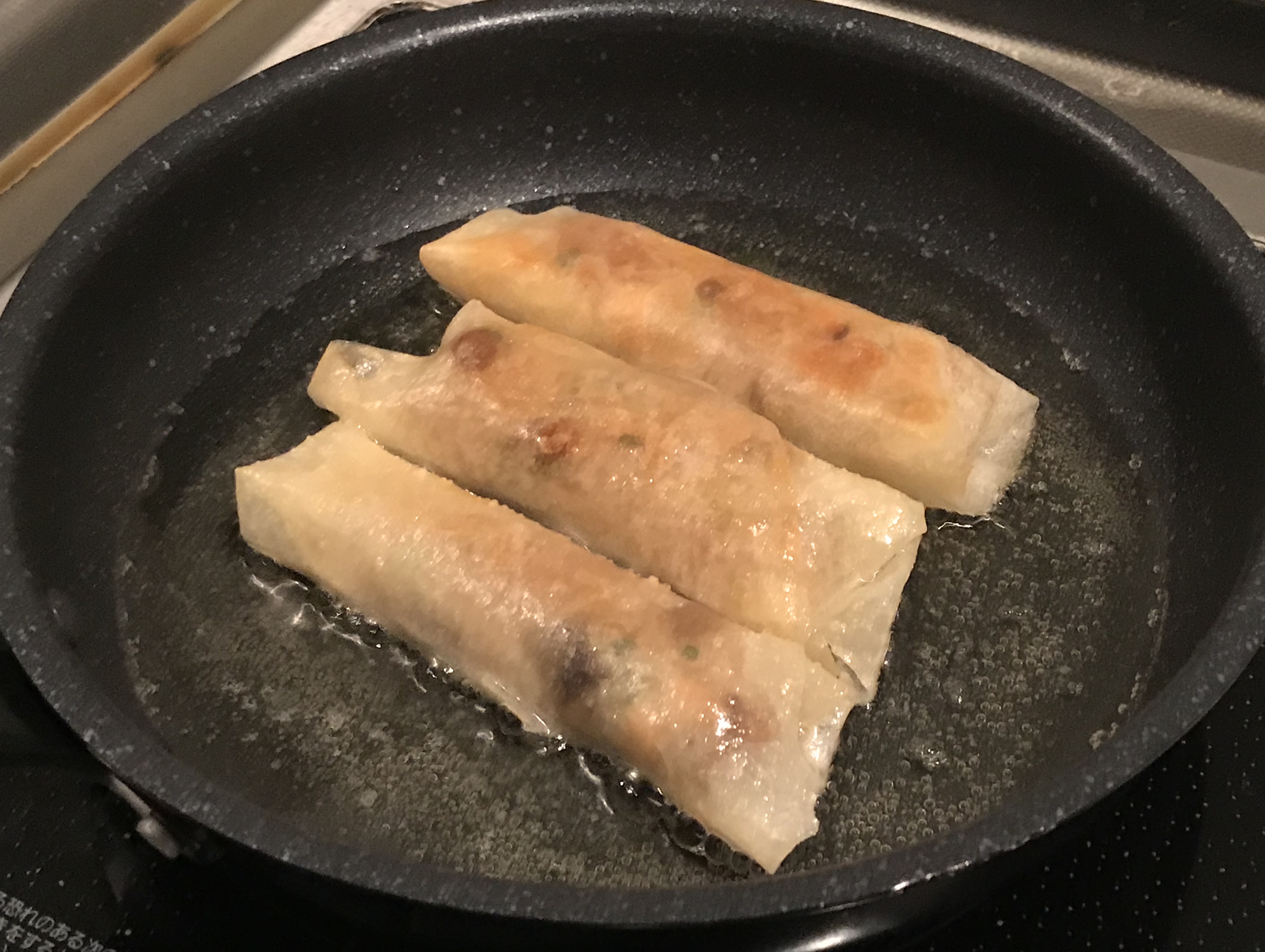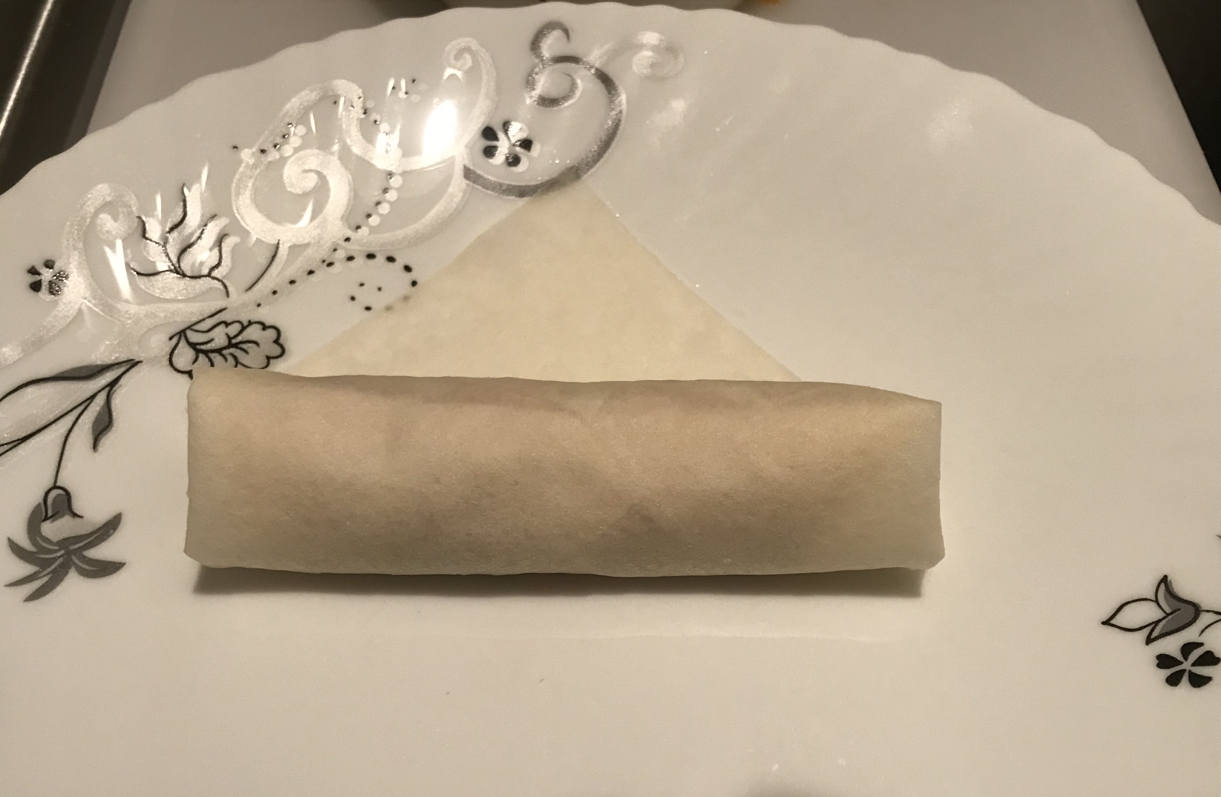 6.Fry about 5-8 minutes or until spring wrapper is done.