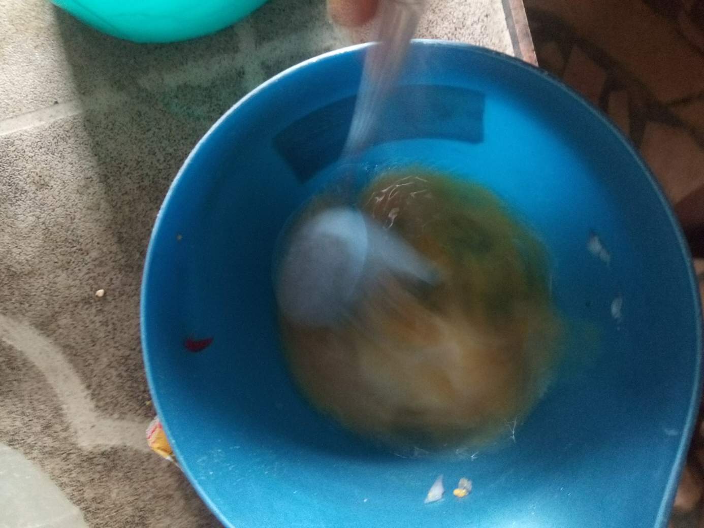 Pouring the whisked egg inside the hot groundnut oil on the cooking device.