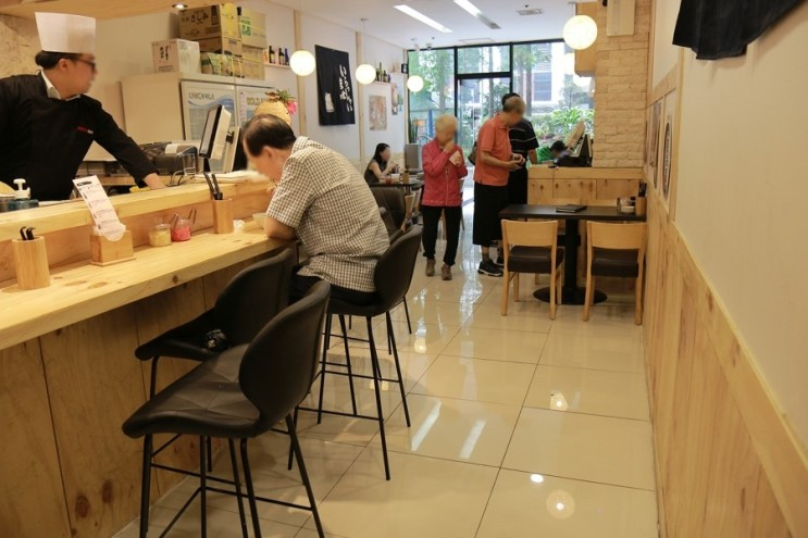 There are 6 to 8 tables with 4 seats, and there are 8 seats in the bar in front of the boss.