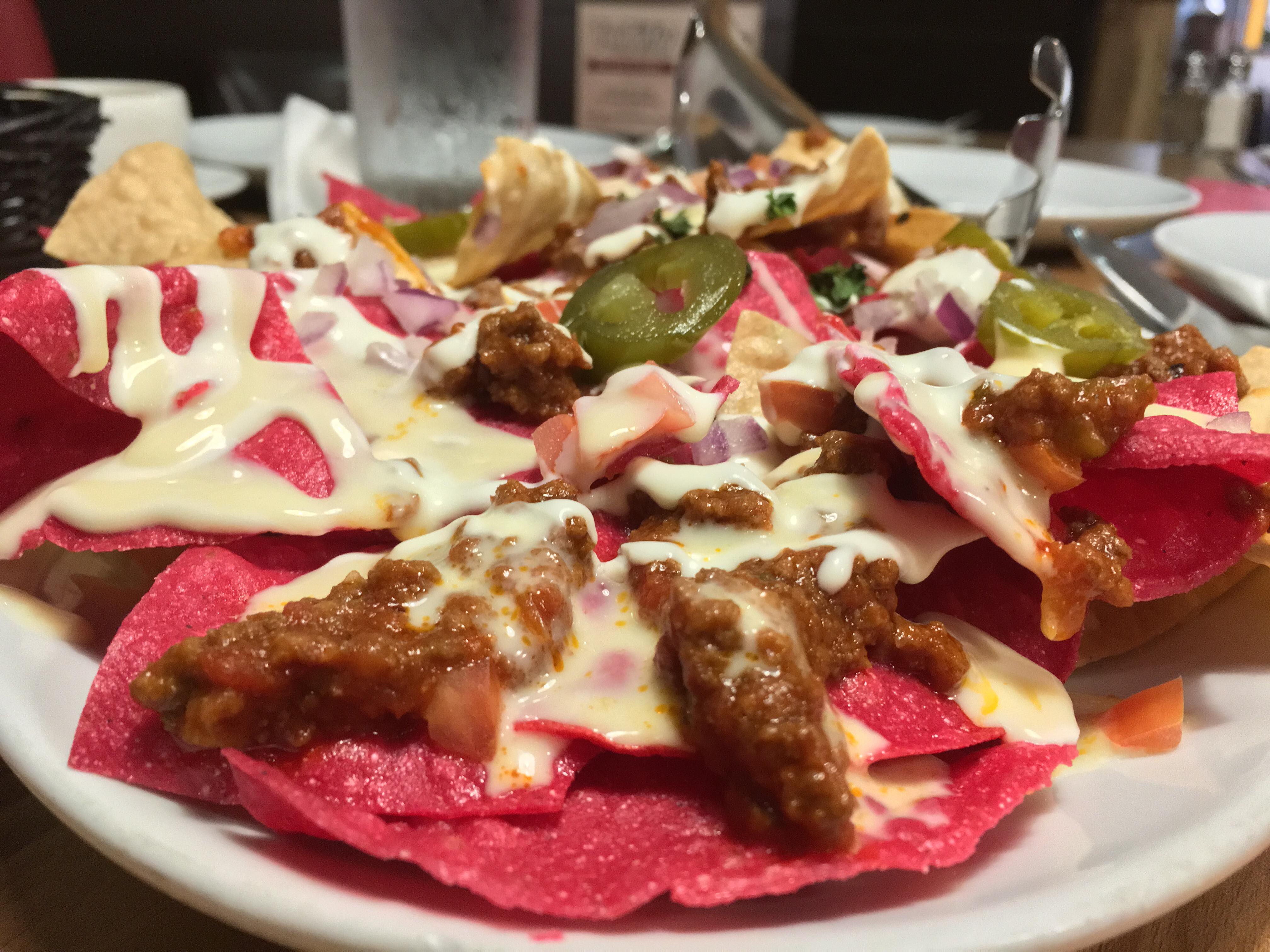 Crunchy nacho chips layered with pico de gallo, ground beef and cheese sauce