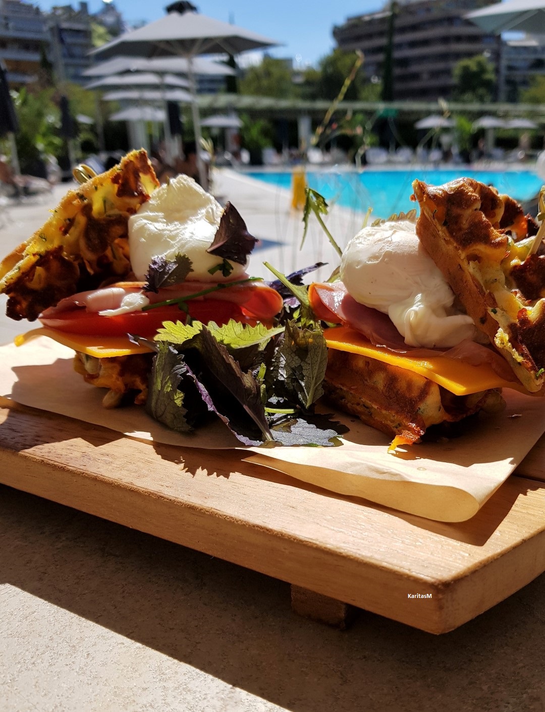 Traditionally, my swimming buddies and I celebrate the beginning and the end of the season with a light meal or drinks and this time around, yesterday we gathered for a poolside brunch where we all ordered a few choices from the Hilton Oasis Restaurant pool breakfast menu that included the delicious savory waffles seen in the photo (above).