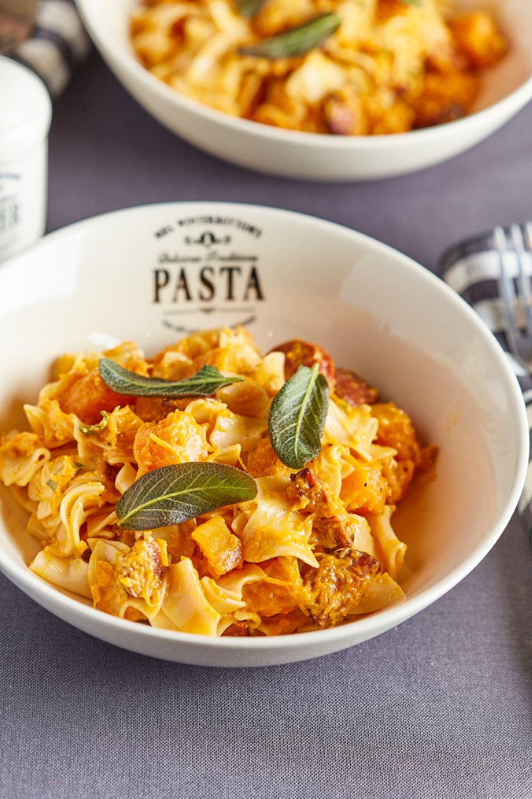 A tésztát al dantére főzzük sós vízben, leszűrjük és 1 dl főzővizet félrerakunk. Egy nagy lábasban az olívaolajon megpirítjuk a zsályalevelek felét és kiszedjük. Ezután beledobjuk a sütőtököt és közepesen lángon kb. 10 percig pirítjuk. Majd jöhet rá a felszeletelt kolbász, sózzuk, borsozzuk és 3-4 percig pirítjuk.