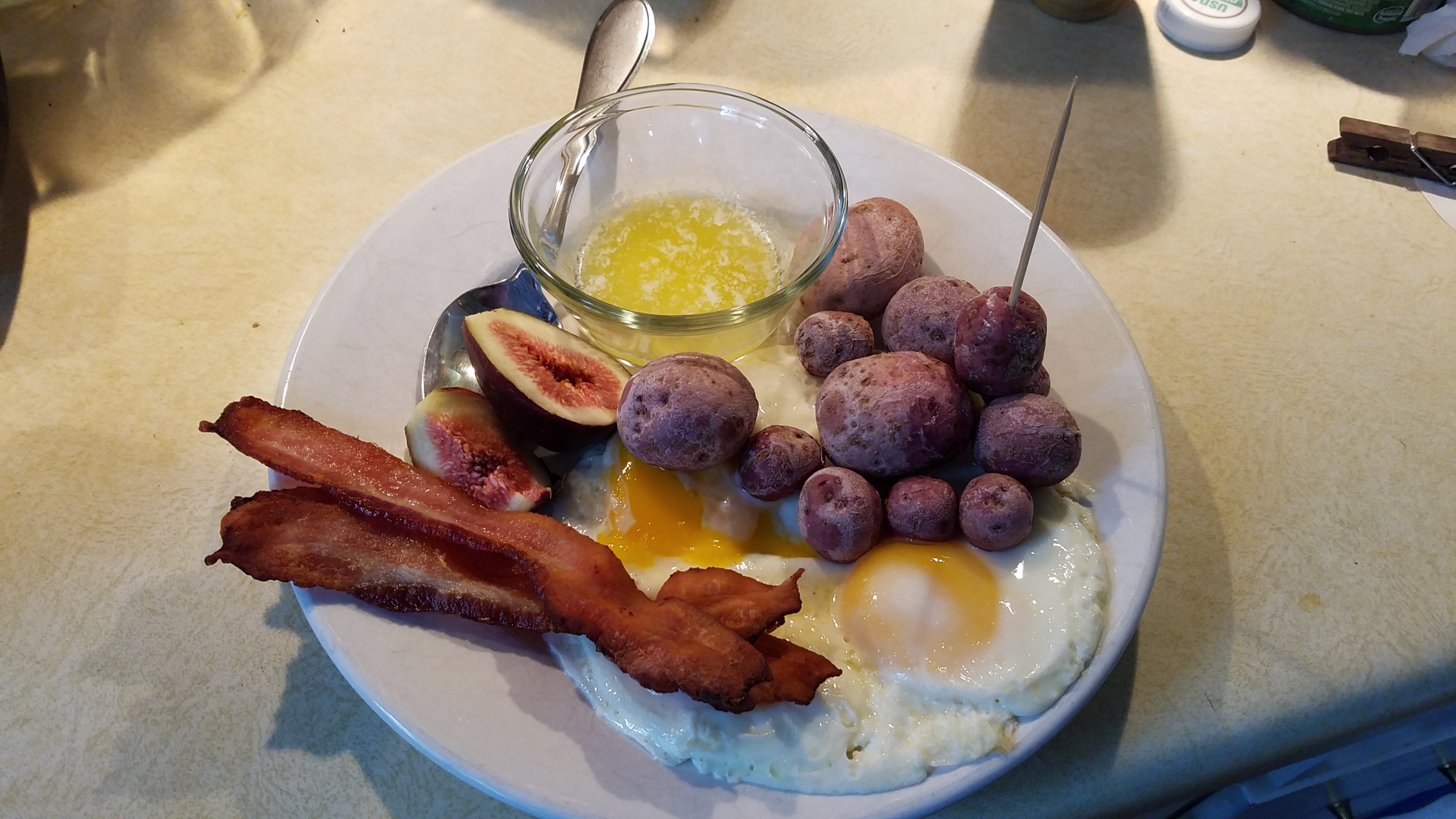 My wife made us brunch with bacon and eggs. I harvested the potatoes from our garden a few days ago. They are delicious this way by cooking them in very salty water, dipped in butter as they are eaten.
