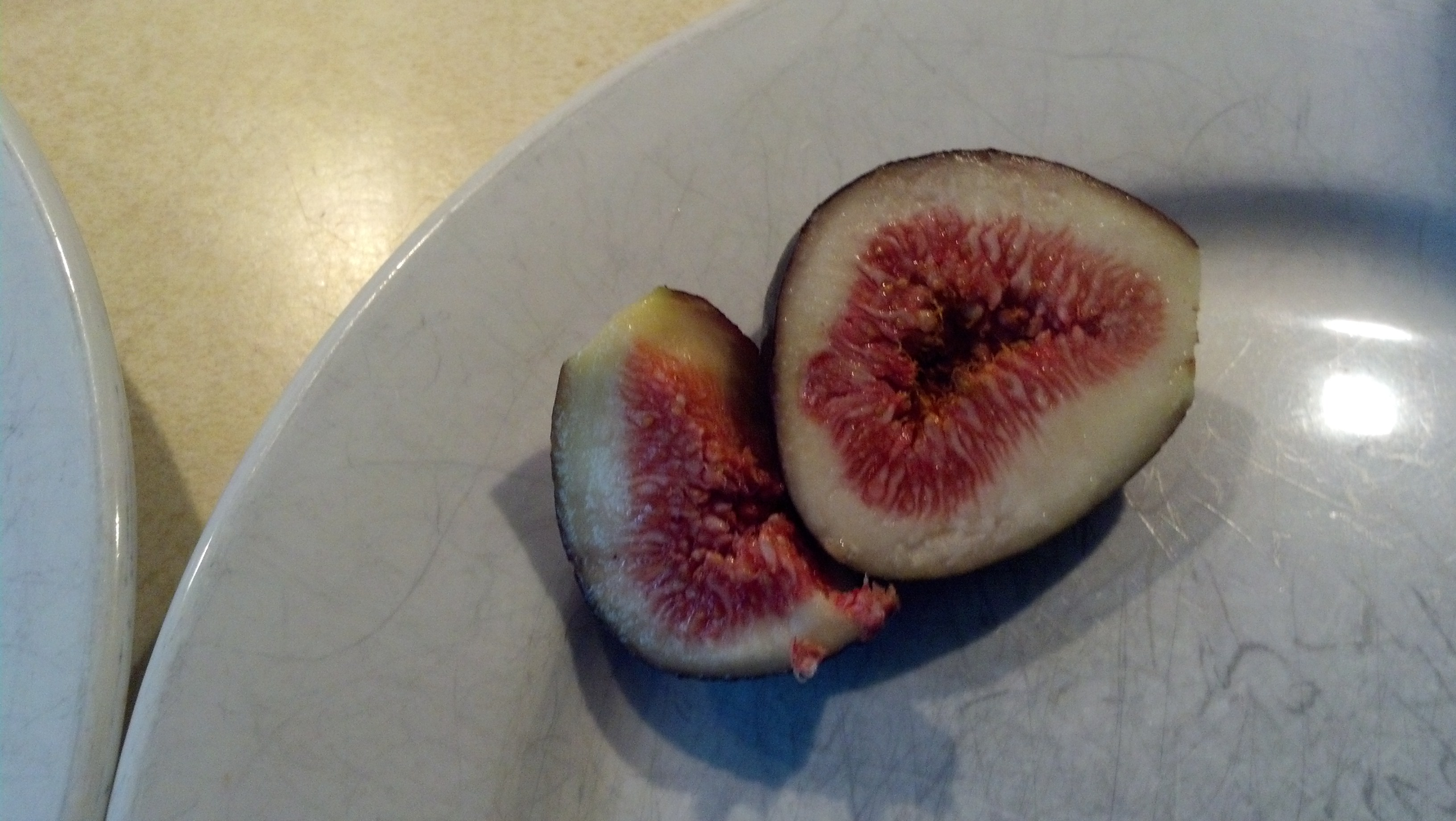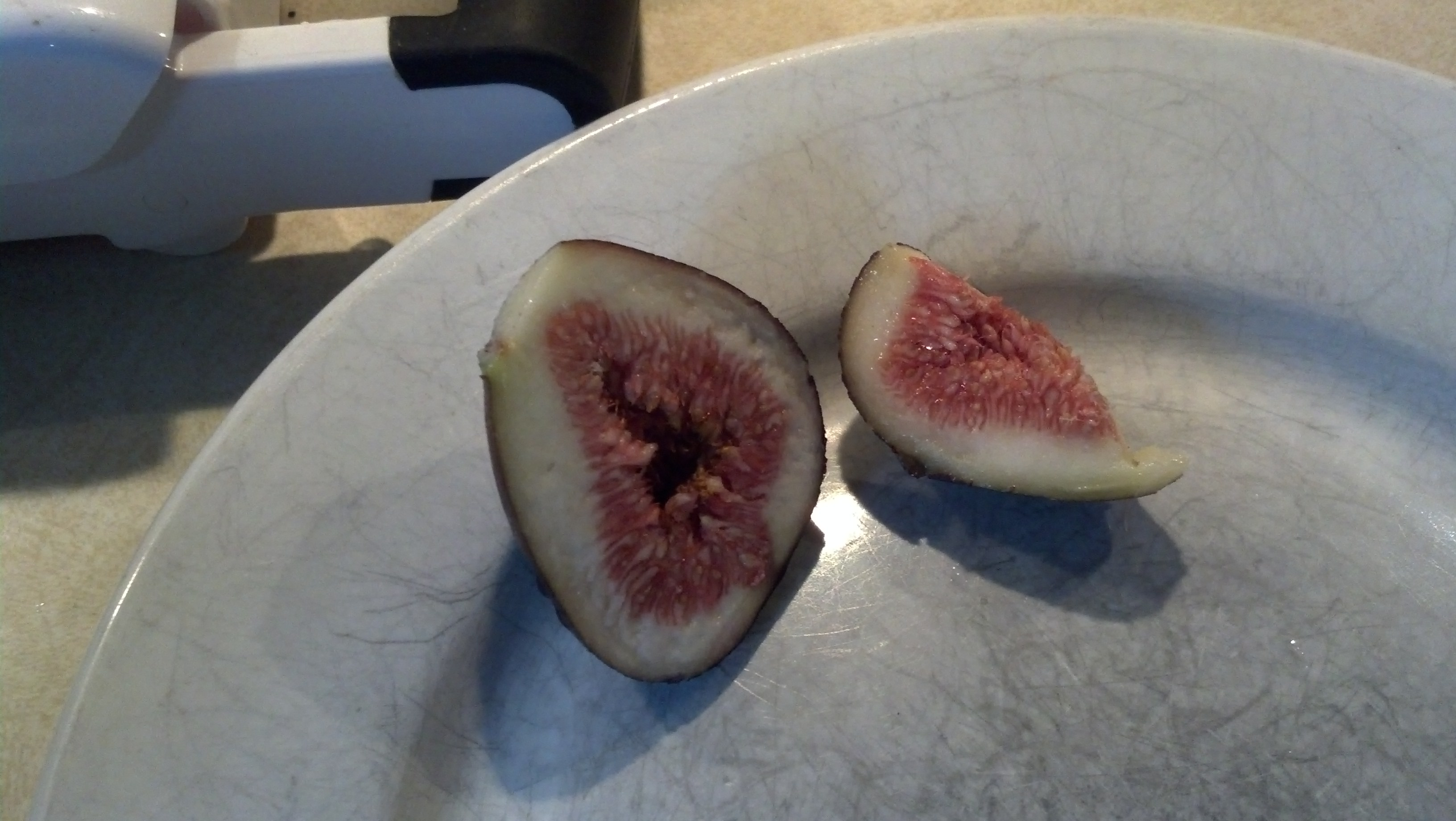 One of the two figs had a spot that we cut off, which left us (my wife and myself) with about one and a third fig each. From looking at them, I wondered if the white part next to the skin was an indication of not being fully ripe.