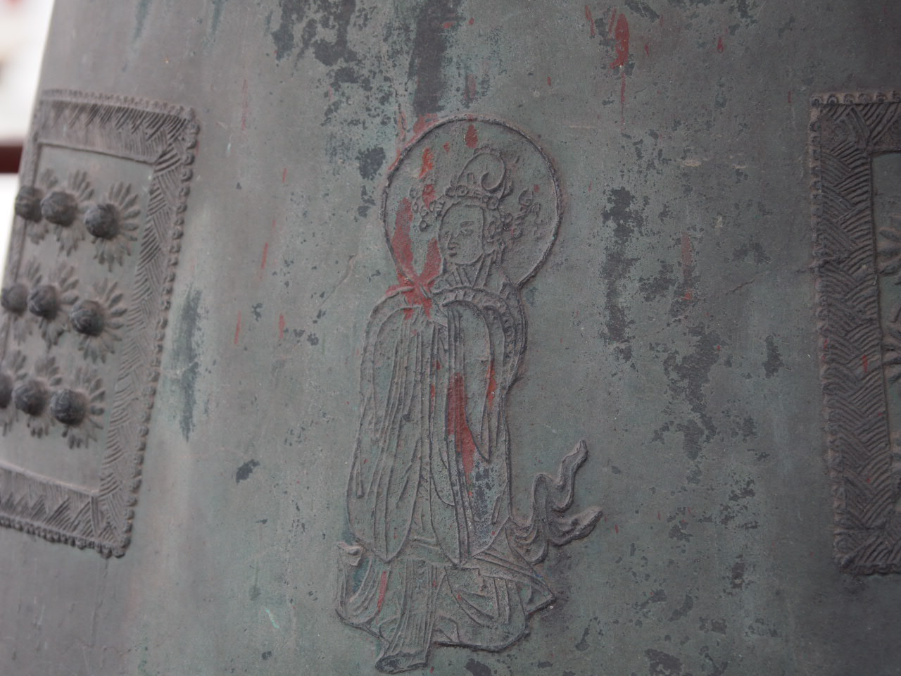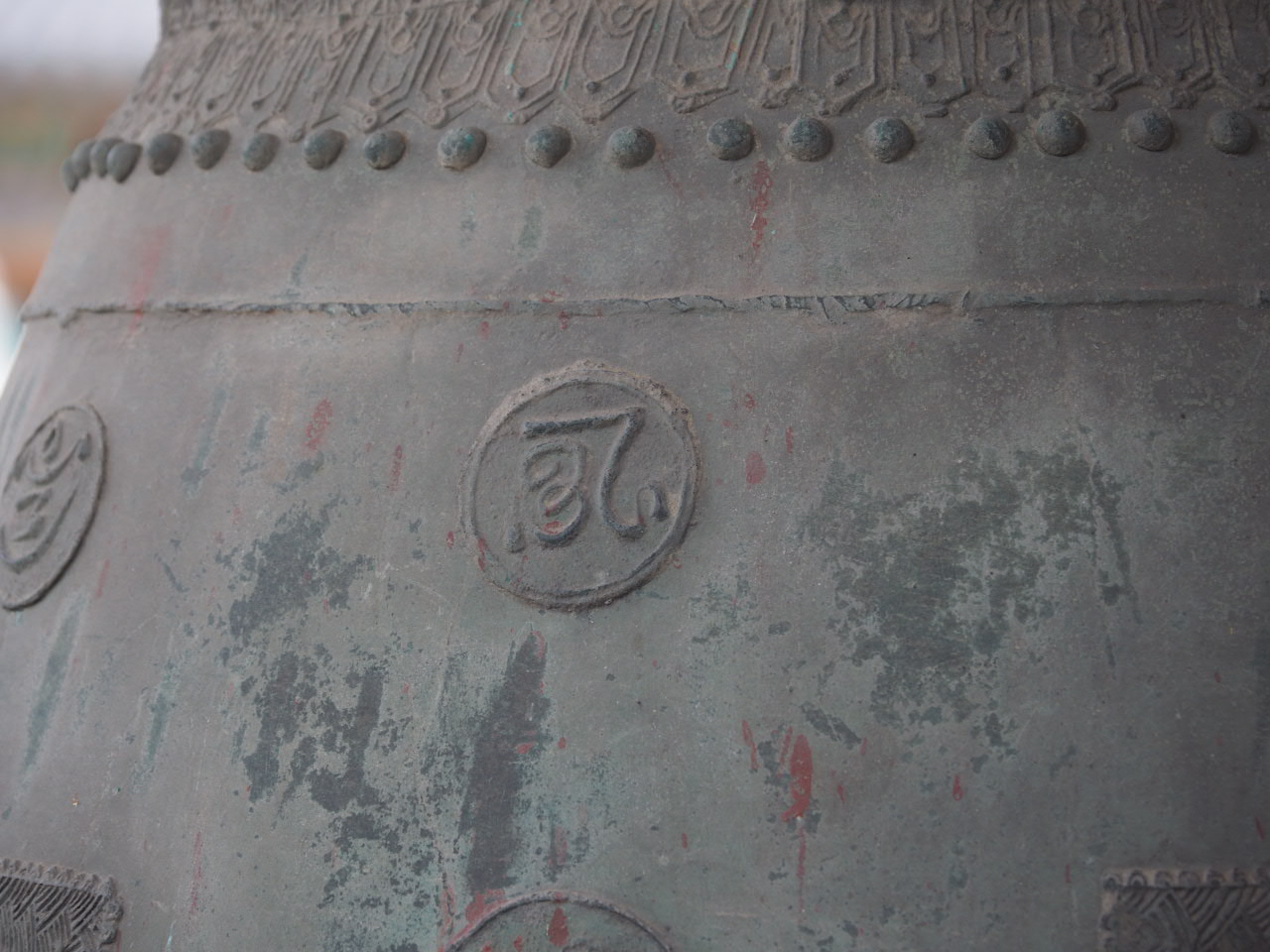 범종에 산크리스트어 같은 문자가 양각되어 있네요. 세월에 바랜 빛이 아름다워요.