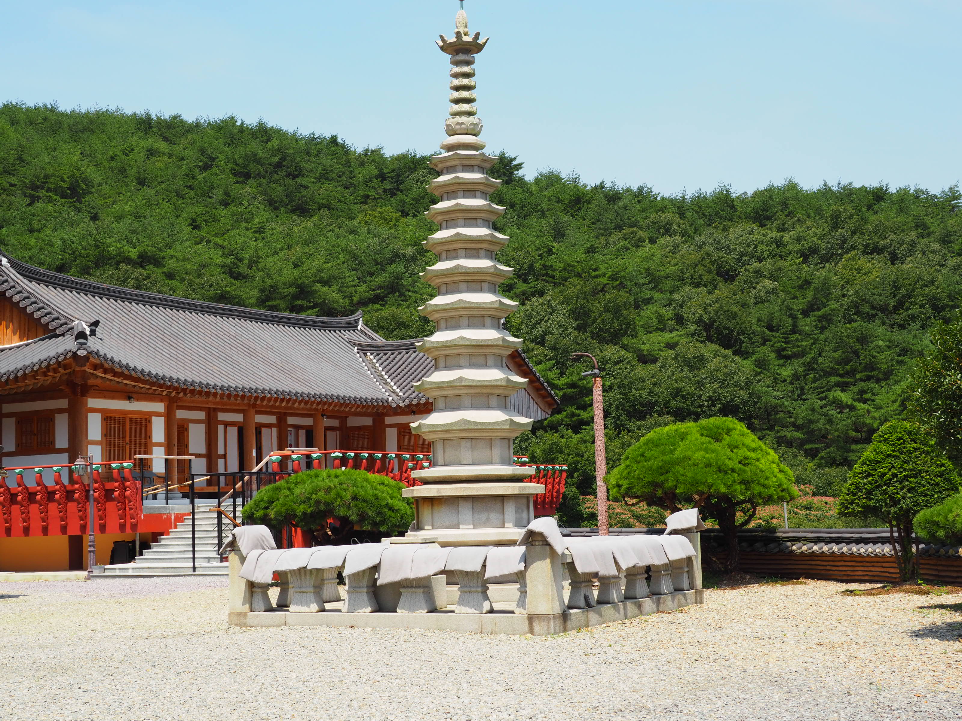 대웅전 계단과 탑에 방석을 말리고 있었다.