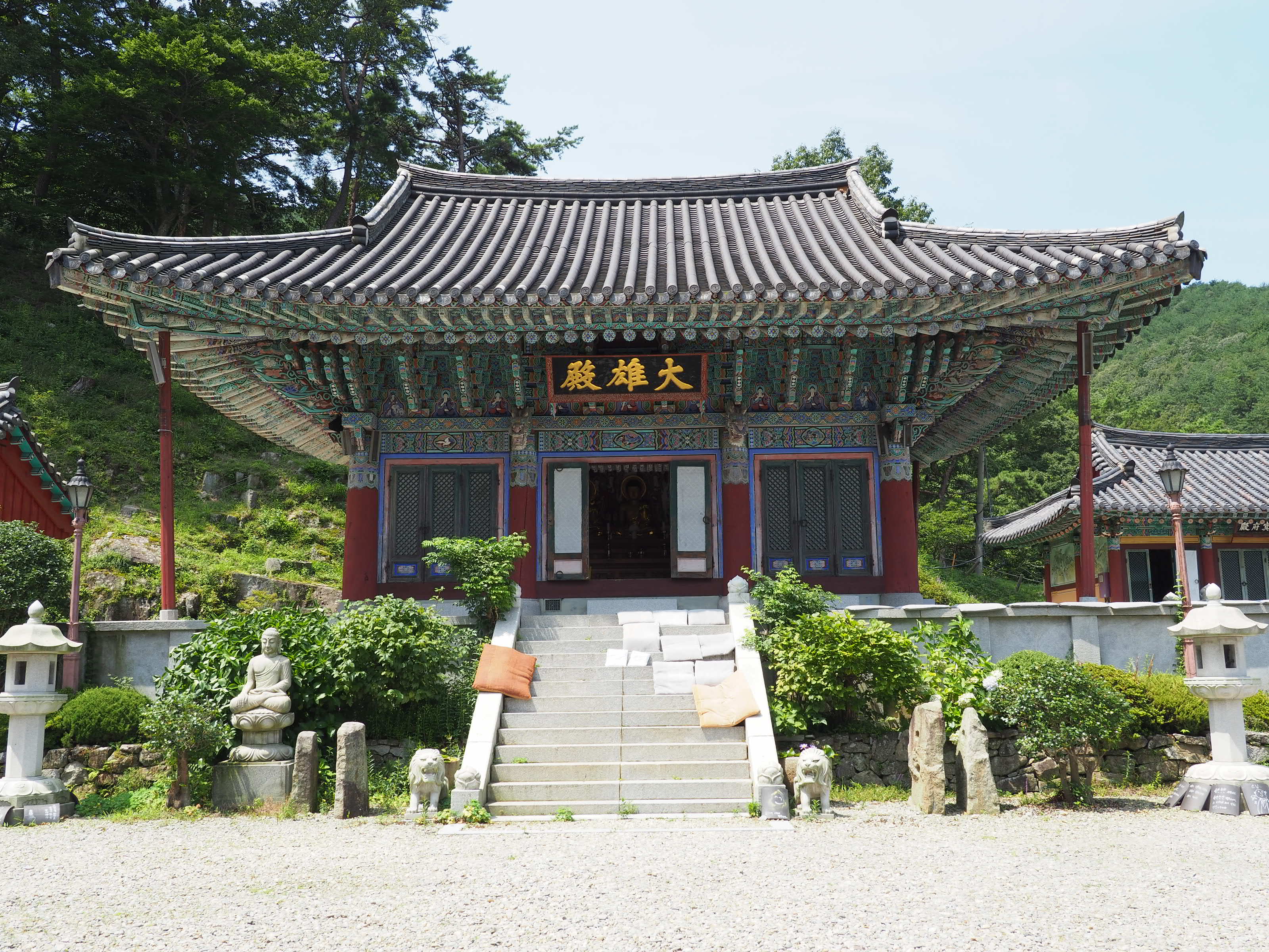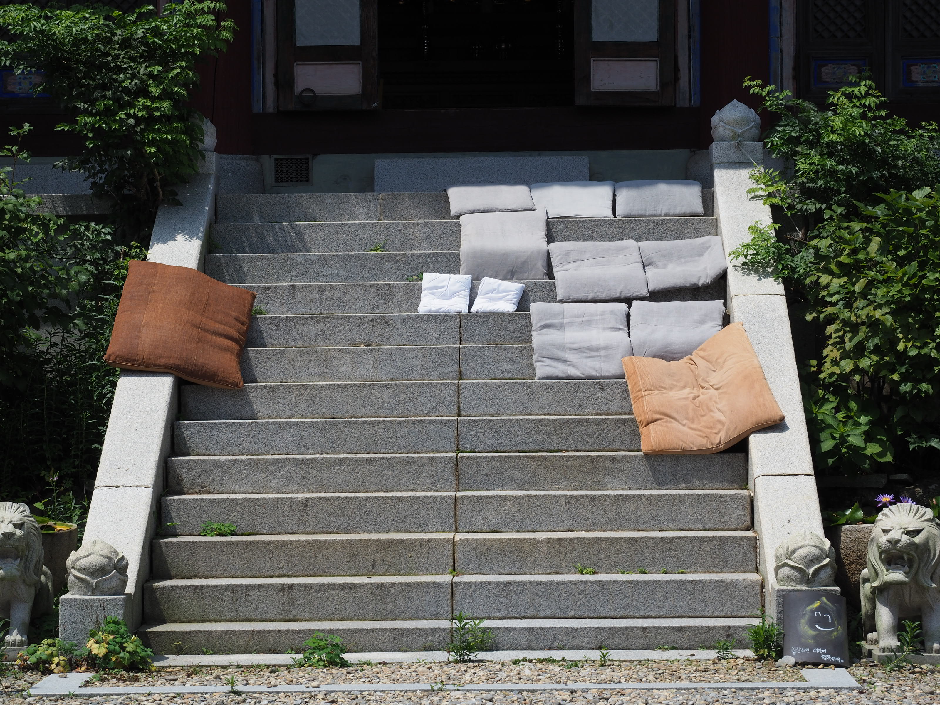 대웅전 앞에 올라갔더니 비구니 스님이 방석을 여기저기 말리고 있었다.