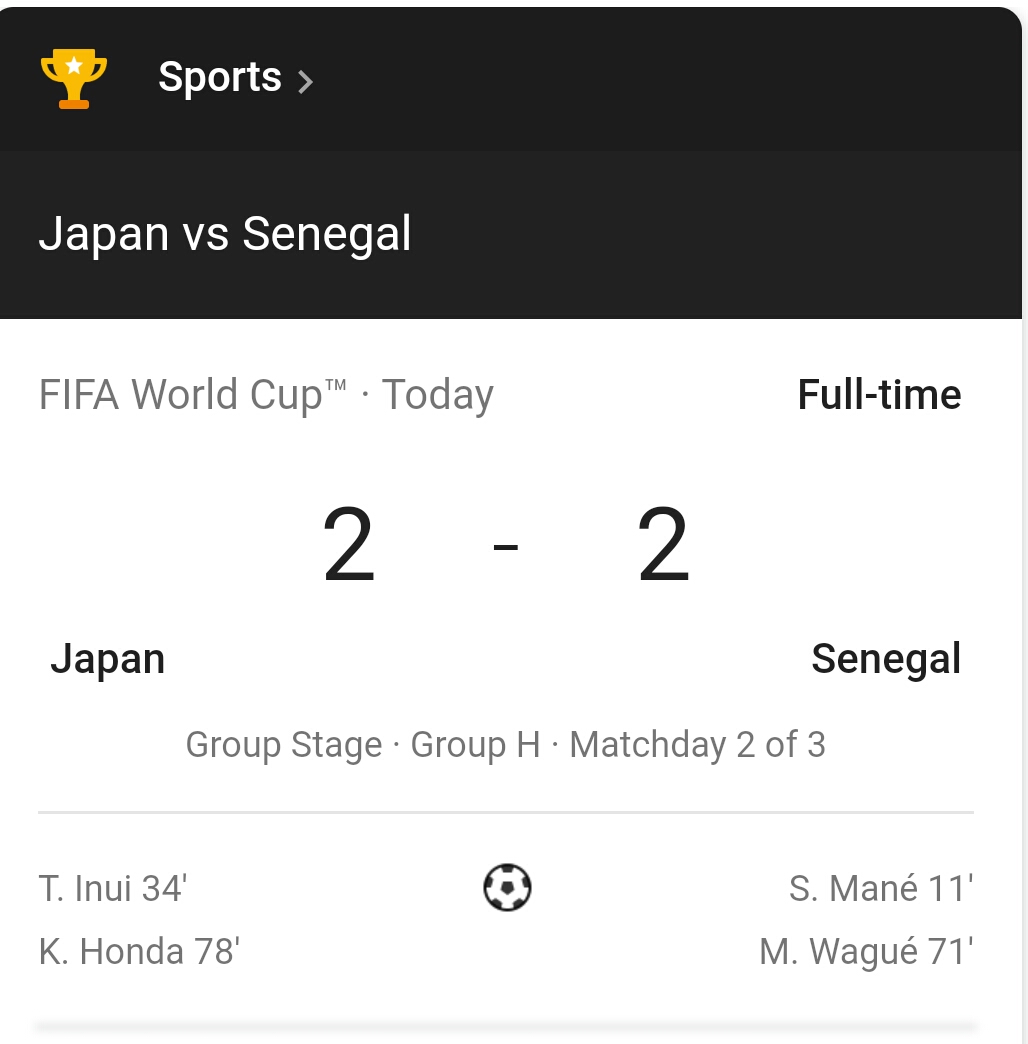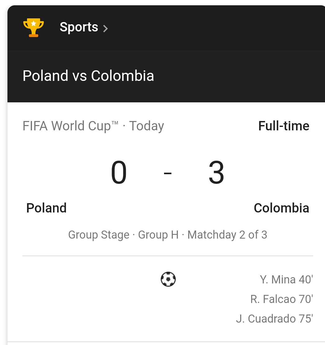 FIFA WORLD CUP, 2018 (TODAY'S MATCH RESULTS)evarich (49)in #football • 8 years ago Below are the results for the FIFA World Cup results for today. England 6 : 1 Panama Japan 2 : 2 SenegalPoland 0 :3 Columbia Poland 0 : 3 Columbia #sports #wafrica #england #untalented