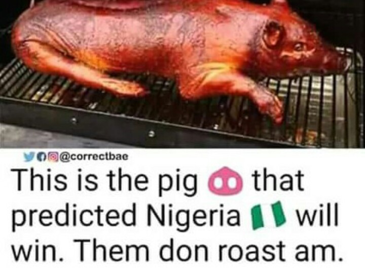 Some people won't just kill me, Nigerians no get chill at all... We all heard that a pig predicted that the super Eagles of Nigeria would qualified for semi finals but just because they were defeated by Croatia in their first match shouldn't right them off so quick, anything can still happen at least people should have put their mind at rest. People have been calling them names, saying all sort of insults. I saw this picture online that the pig that predicted that the Nigeria team would qualified have been roasted, I don't know how true is this but this is just cracking me up at the moment.